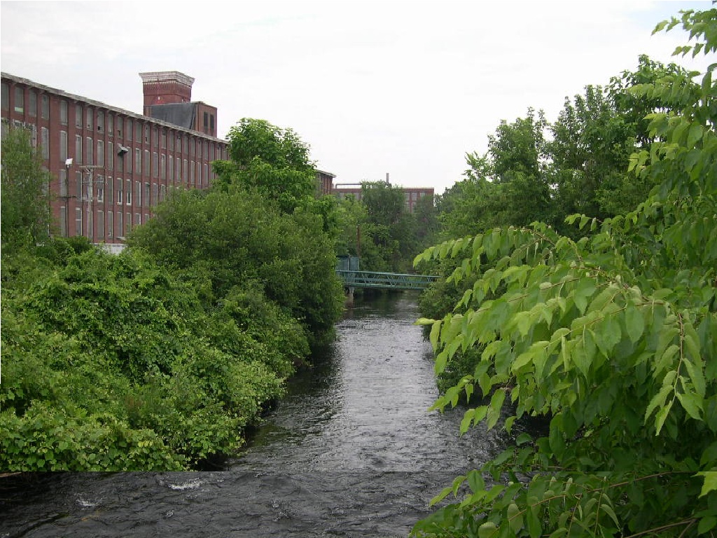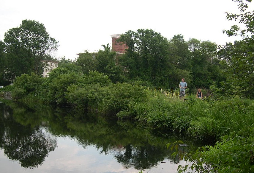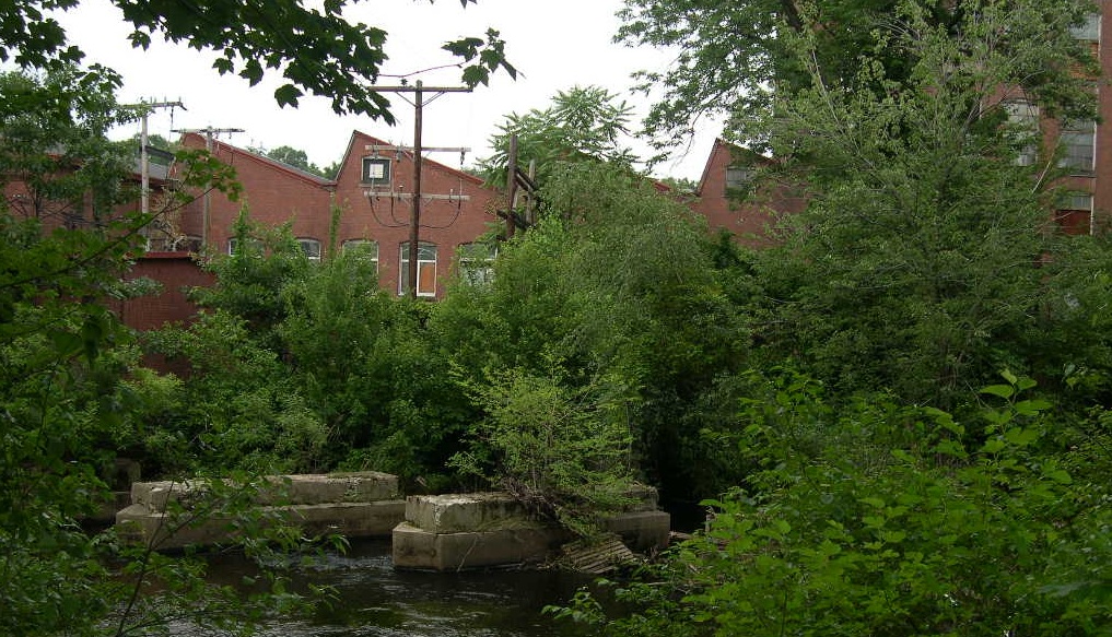 Southward view of mill with Woonasquatucket River (flowing downstream from this point).