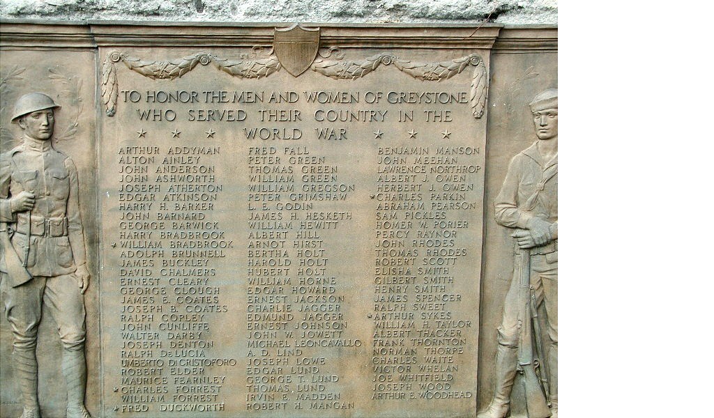 WWI Memorial in Greystone, Rhode Island with Peter Grimshaw Named