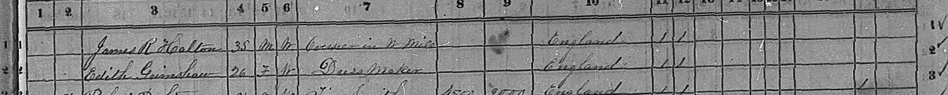 |—John Grimshaw (ca 1833, Wigan, Lancashire – ?) & Jane Leyland (ca 1838, Wigan, Lancashire – ?). Married 1857, Wigan, Lancashire.
