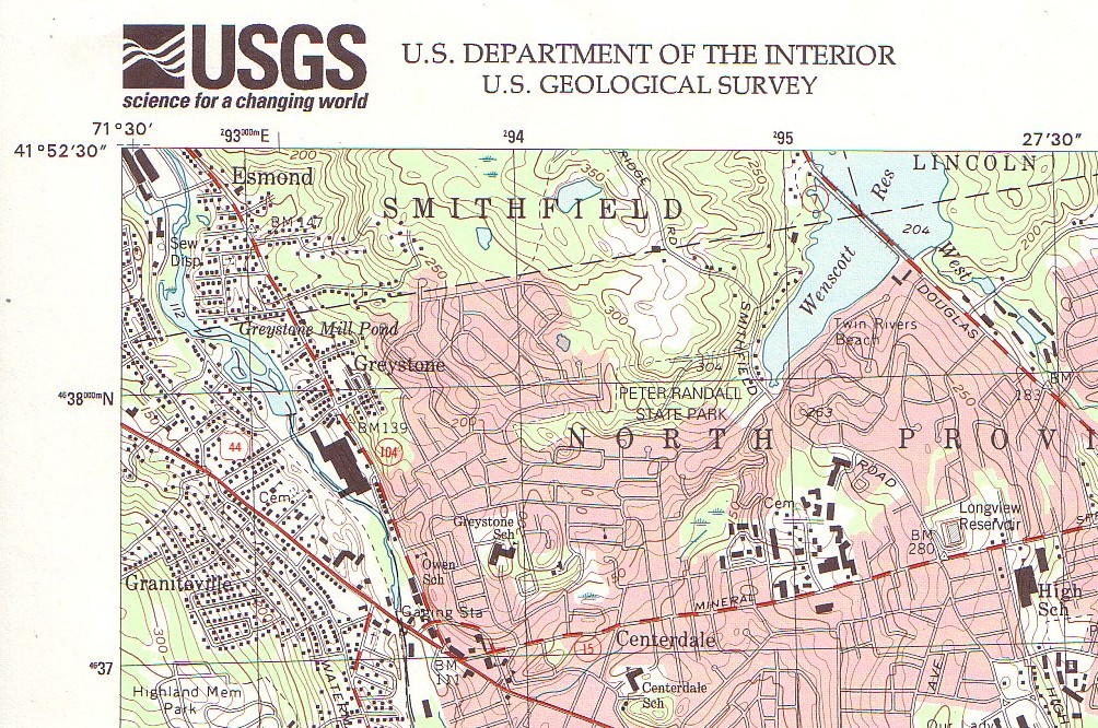 Topographic Map of the area around Greystone, showing Greystone Mill Pond, where the Greystone Mill was formerly located (on the north side of the road crossing the river just below the dam). Map is from the U.S. Geological Survey, Providence, RI quadrangle1.