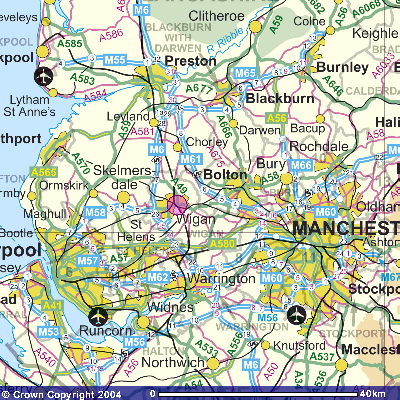 Location of Wigan about midway between Liverpool and Manchester. From British Ordnance Survey Get-a-Map service.