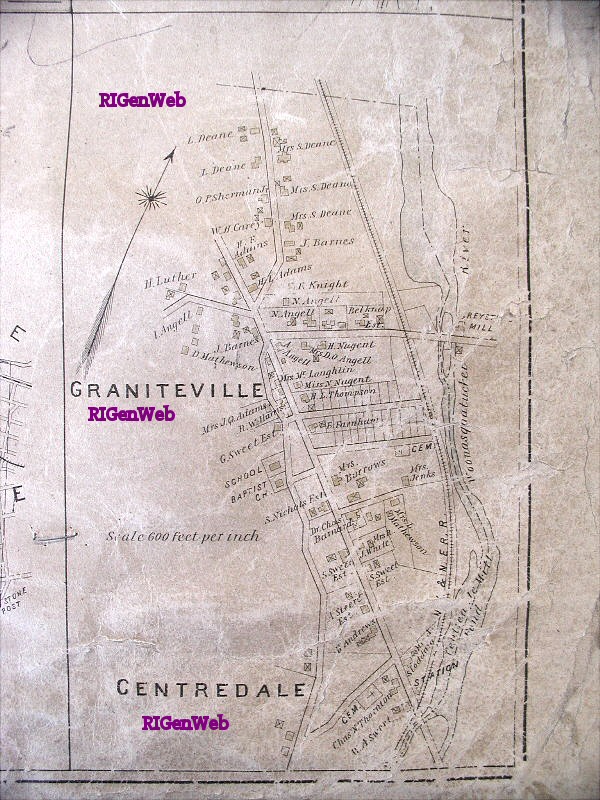 An old map of nearby Graniteville and Centerdale (undated) shows the location of Greystone Mill on the north side of the road near the bridge across the Woonasquatucket River (shown below).