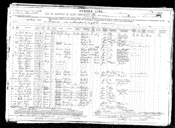 John arrived on August 5, 1896 on the Teutonic. He was from Ashton-under-Lyne. Elizabeth arrived two years later, on August 27, 1898, on the Lucania; she was from Blackpool. Both departed for the U.S. from Liverpool.