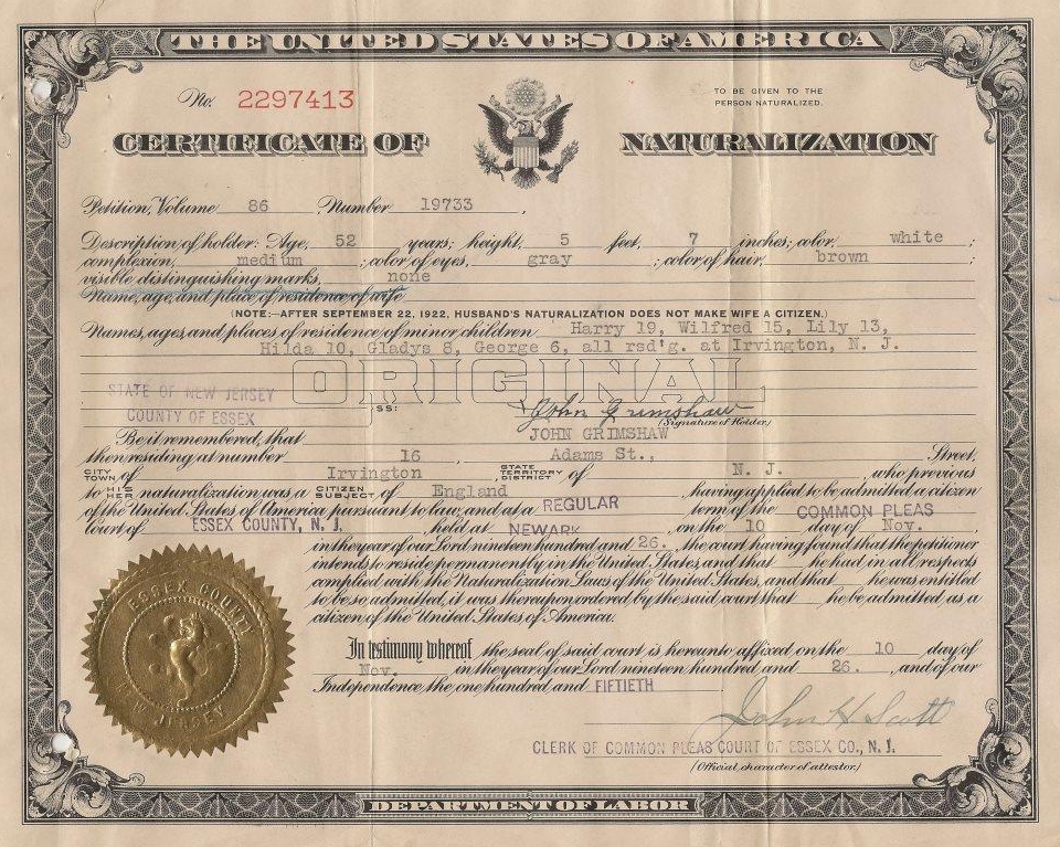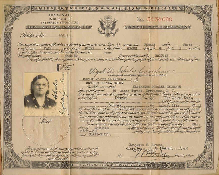 John Grimshaw was naturalized in Newark, NJ on November 10, 1926. Elizabeth was naturalized on August 18, 1941, also in Newark. Their naturalization certificates are shown below.