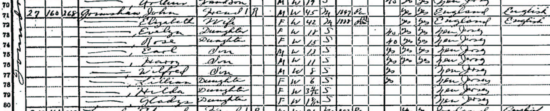 Henry in New Jersey. Sorry the first two emails had sentences that did not quite make sense. What I sent was one sheet from the 1900 US Census, two sheets from the 1910 US Census, and this one sheet from the 1920 US Census. The 1930 US Census is just coming out and is not complete yet, there was no John Henry Grimshaw in New Jersey, yet. I also have access to most of the WFT CDs and will see if I can find anything to match what you are looking for.