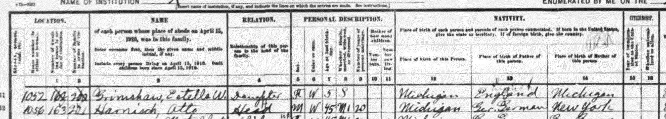 |—Blanche E Grimshaw (Feb 1886, Detroit, MI – ?) & William Bruckman (16 Nov 1873 MI – ?)