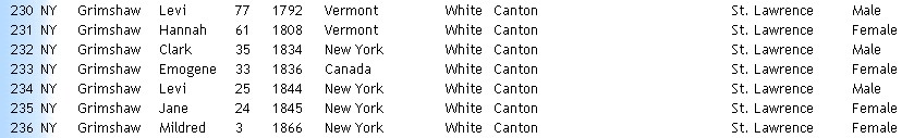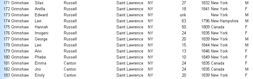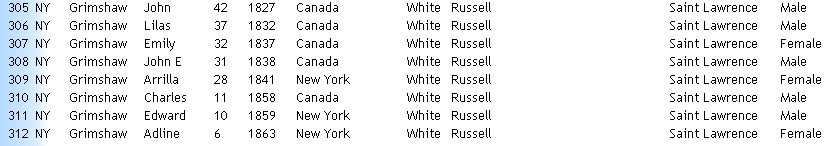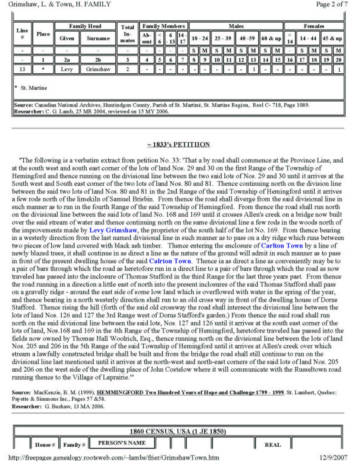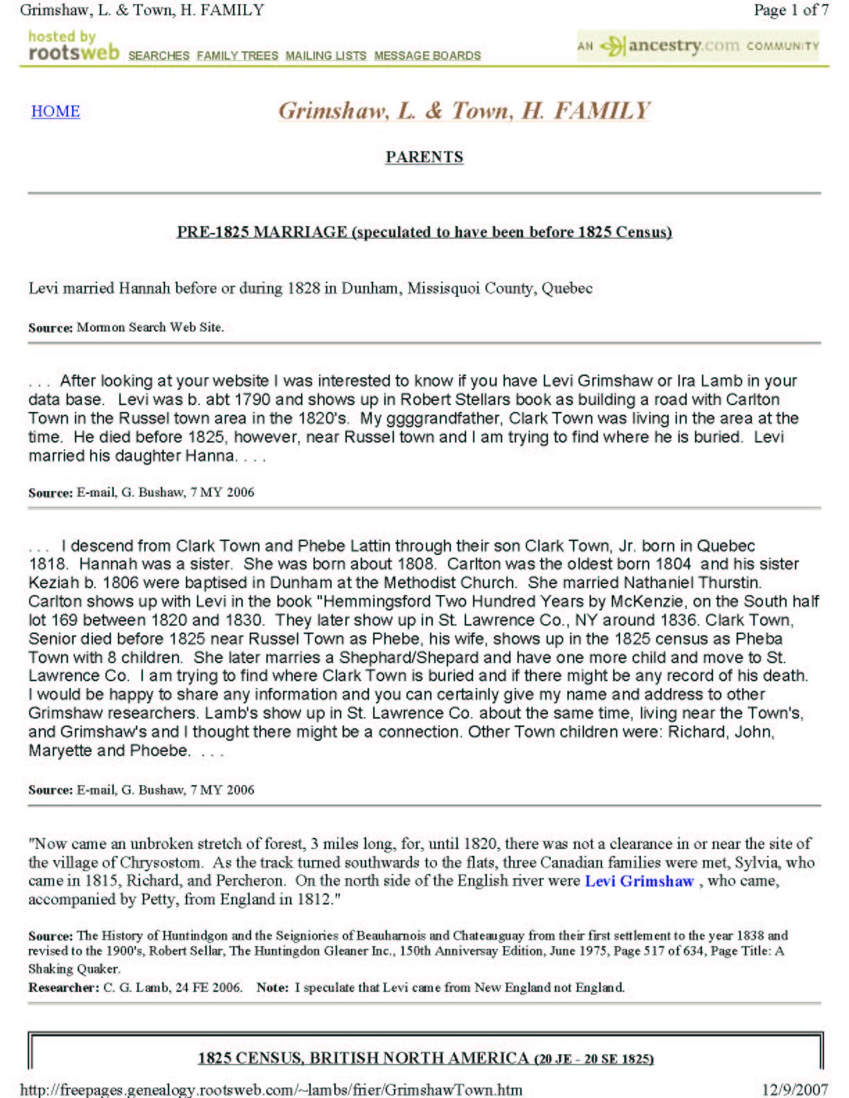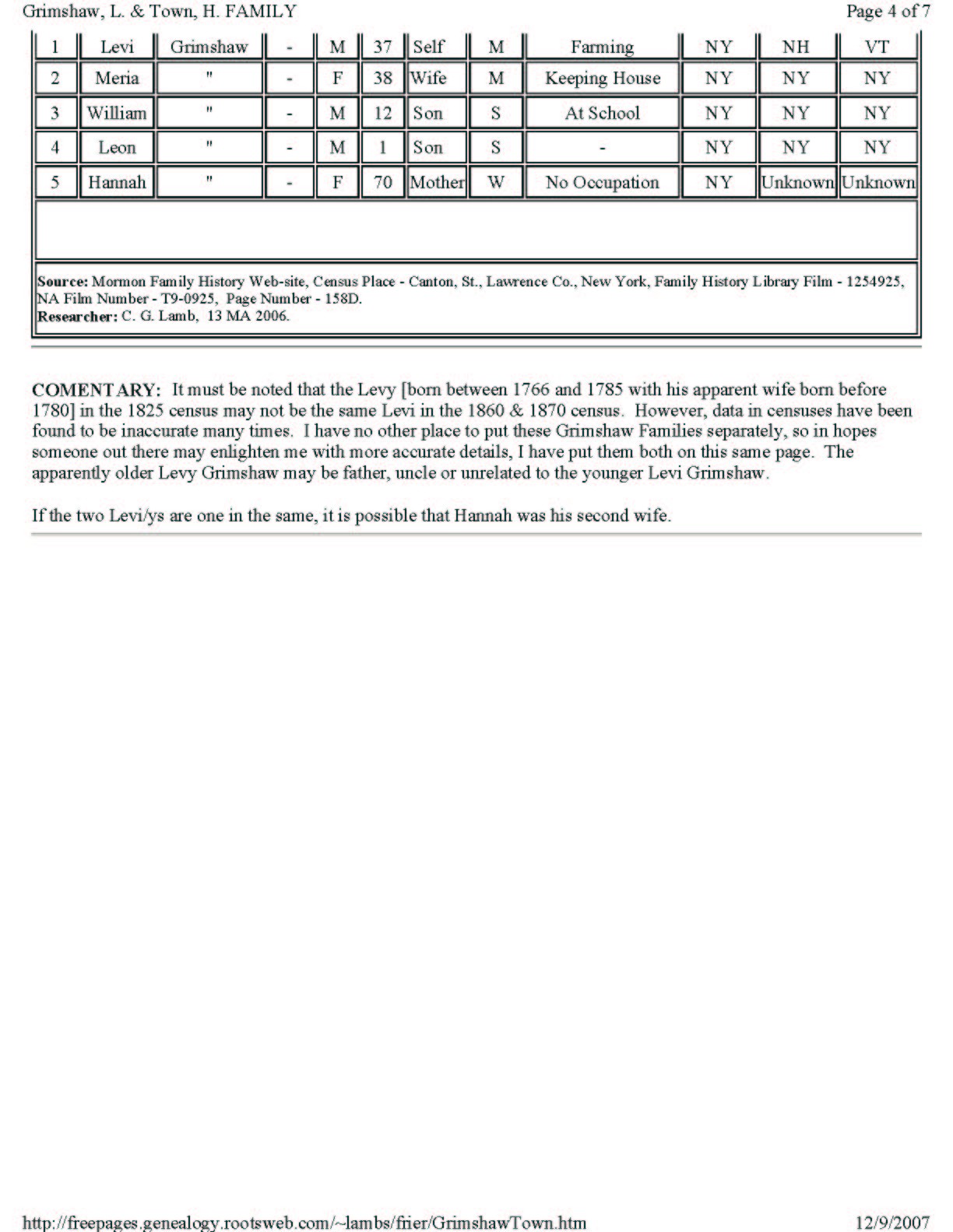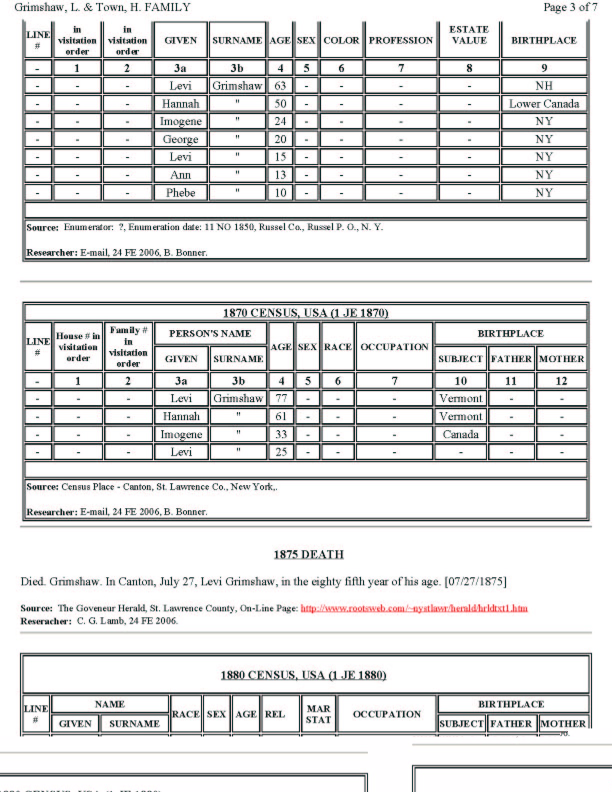 Levi Grimshaw (abt 1797 –  7 Jul 1875, Canton, NY) & Hannah Towne (1808, VT – aft 1880). Married 1828, Dunham, Missisquoi, QC