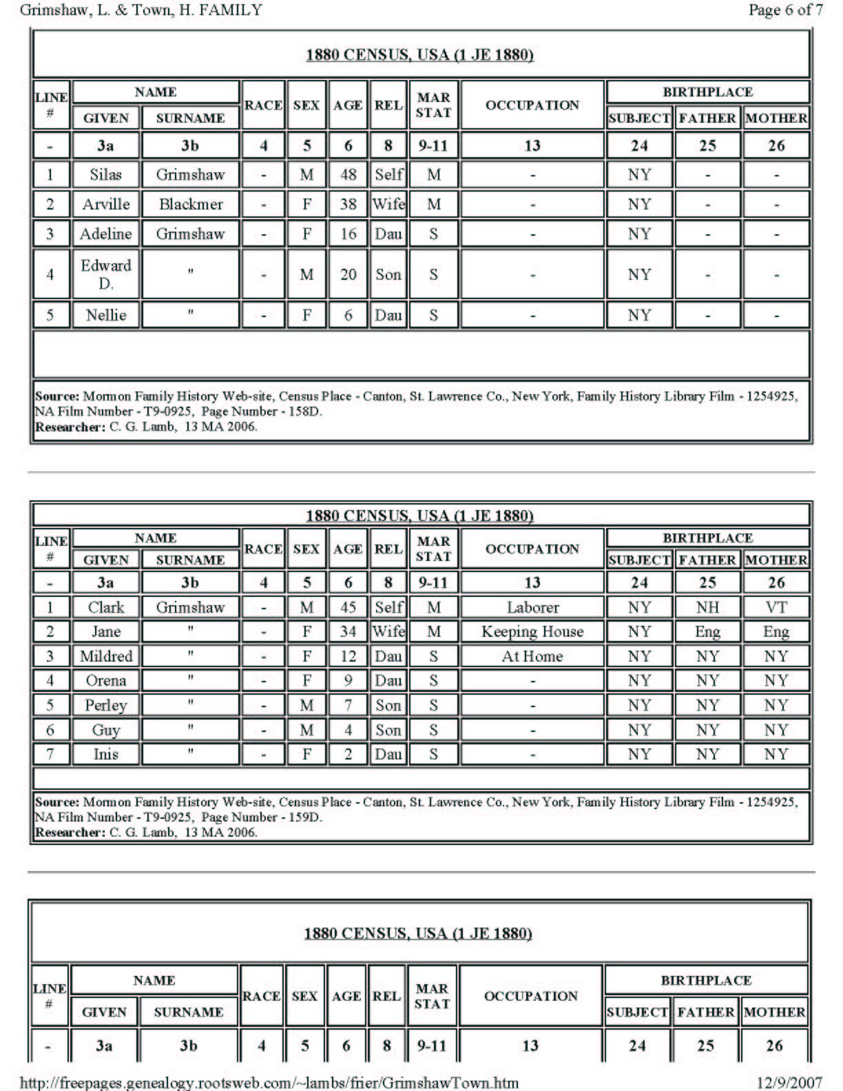 |—|—|—3 Lelah Grimshaw (30 Nov 1882, Russell, NY – 1 Feb 1958, Ogdensburg, NY) & William Henry Carpenter (31 Aug 1878, Russell, NY – 29 Dec 1945, DeKalb, NY). Married 1 Jan 1901, Edwards, NY.