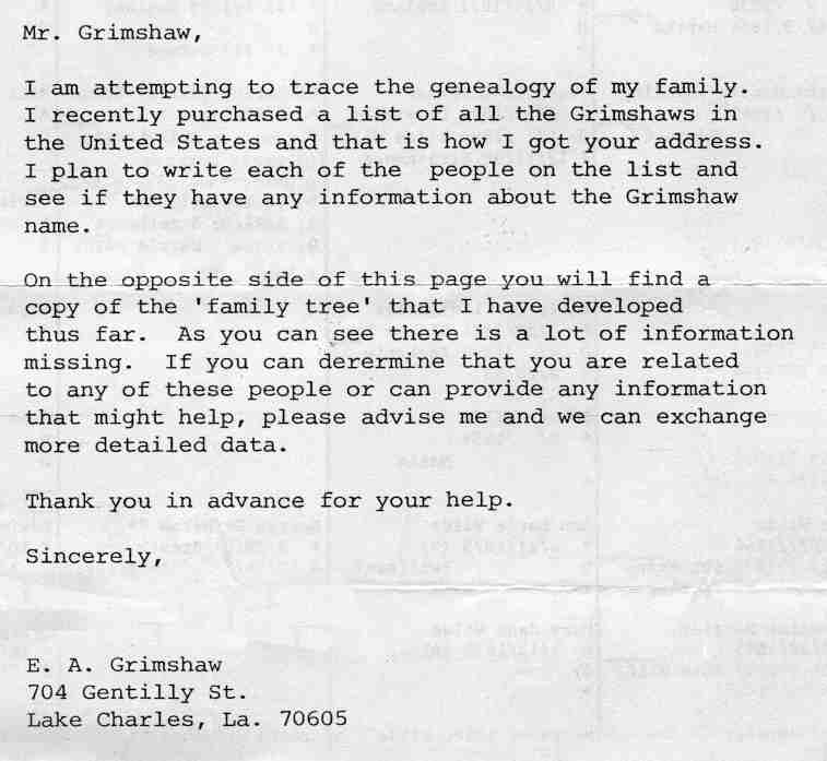 Lee Grimshaw sent a letter to Ed that contained quite a bit of information on his family line, although it is somewhat difficult at first to decipher. The letter appears generally as follows: