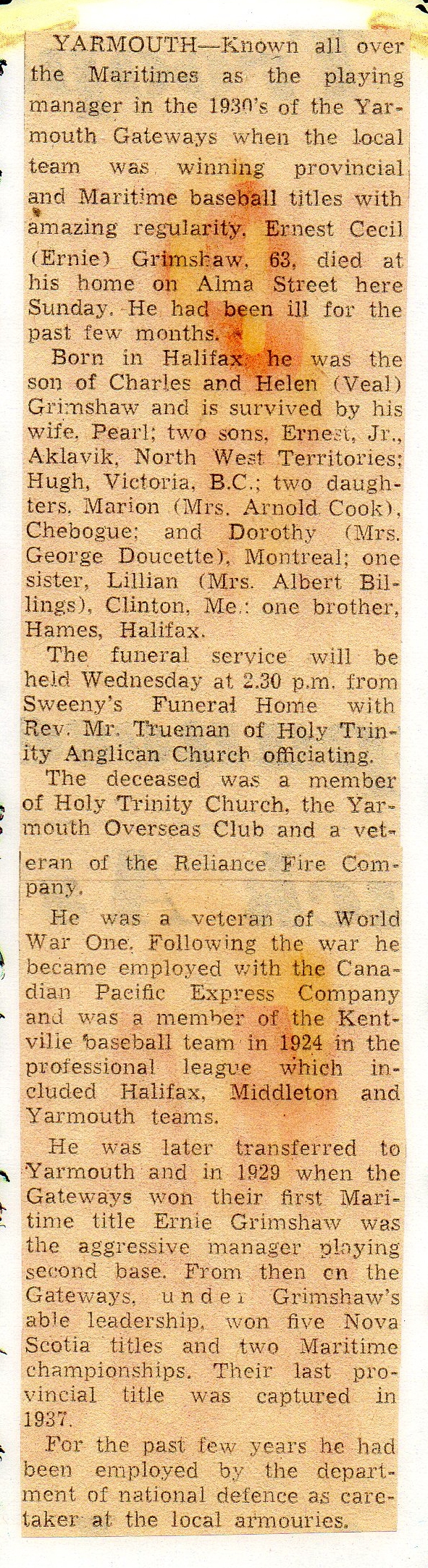 Ernest Cecil Grimshaw’s Obituary in a Halifax Newspaper, February 1, 1960