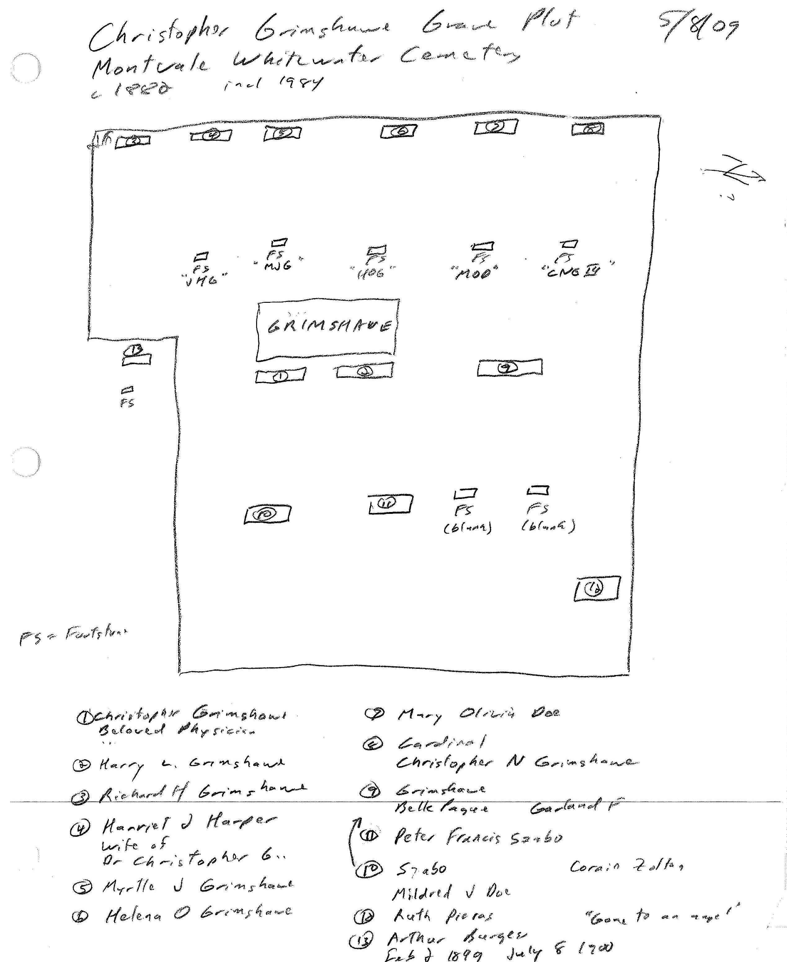 A visit was also made to the Montvale Whitewater Cemetery. The main feature of the Grimshawe plot is a very unusual gravestone apparently commissioned by Christopher Grimshawe. An interpretation that came to the website author’s mind during the visit was “Christ brings emerging order out of chaos”. But who knows what Christopher (or the stone mason) had in mind?! The grave of Harriett (Harper) Grimshaw (wife of Christopher) is above (behind) and to the left of the gravestone of Christopher, near the edge of the plot.