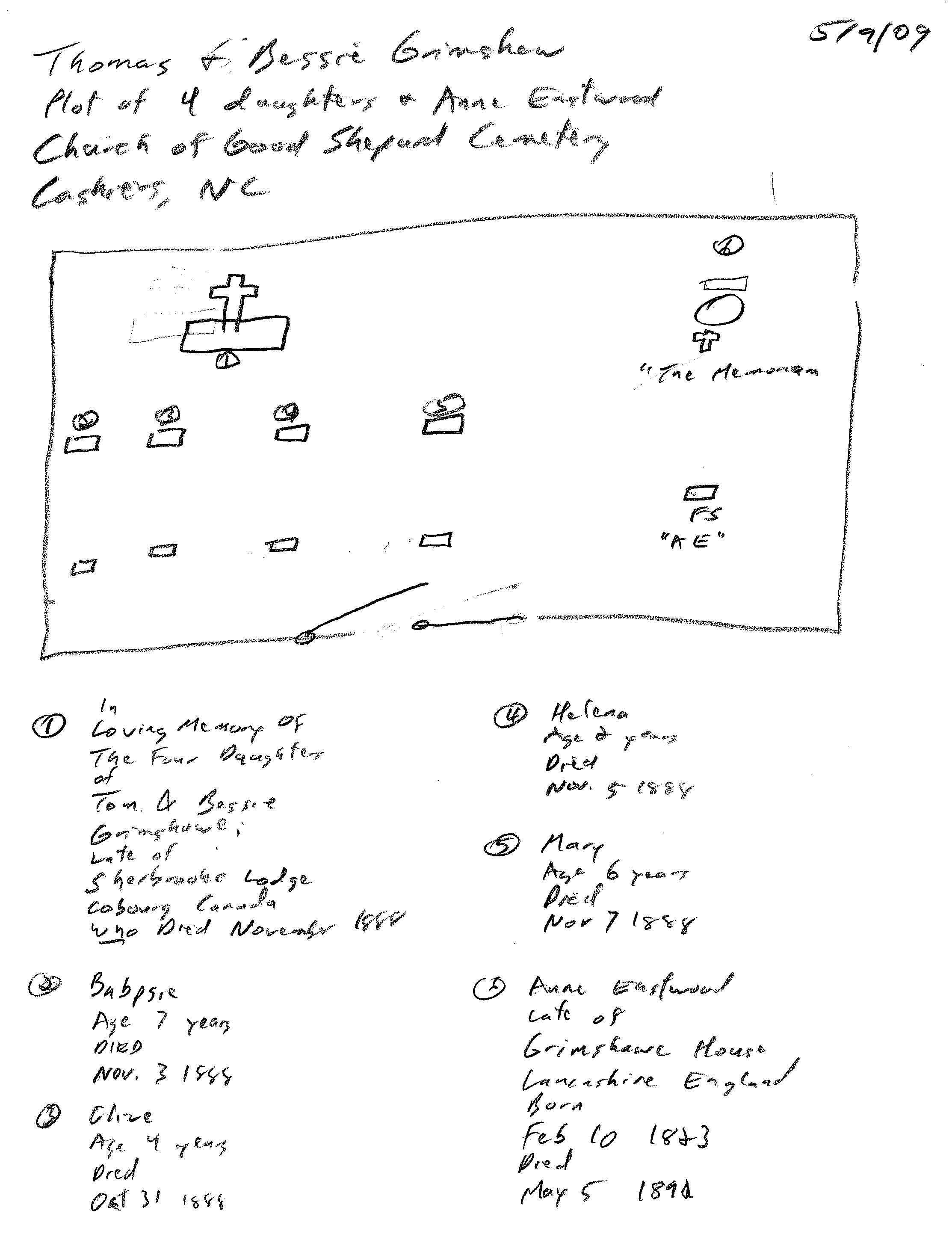 4) The grave plots of the grandchildren of Thomas and Helena Grimshaw at Church of Good Shepard Episcopal Church, south of Cashiers;