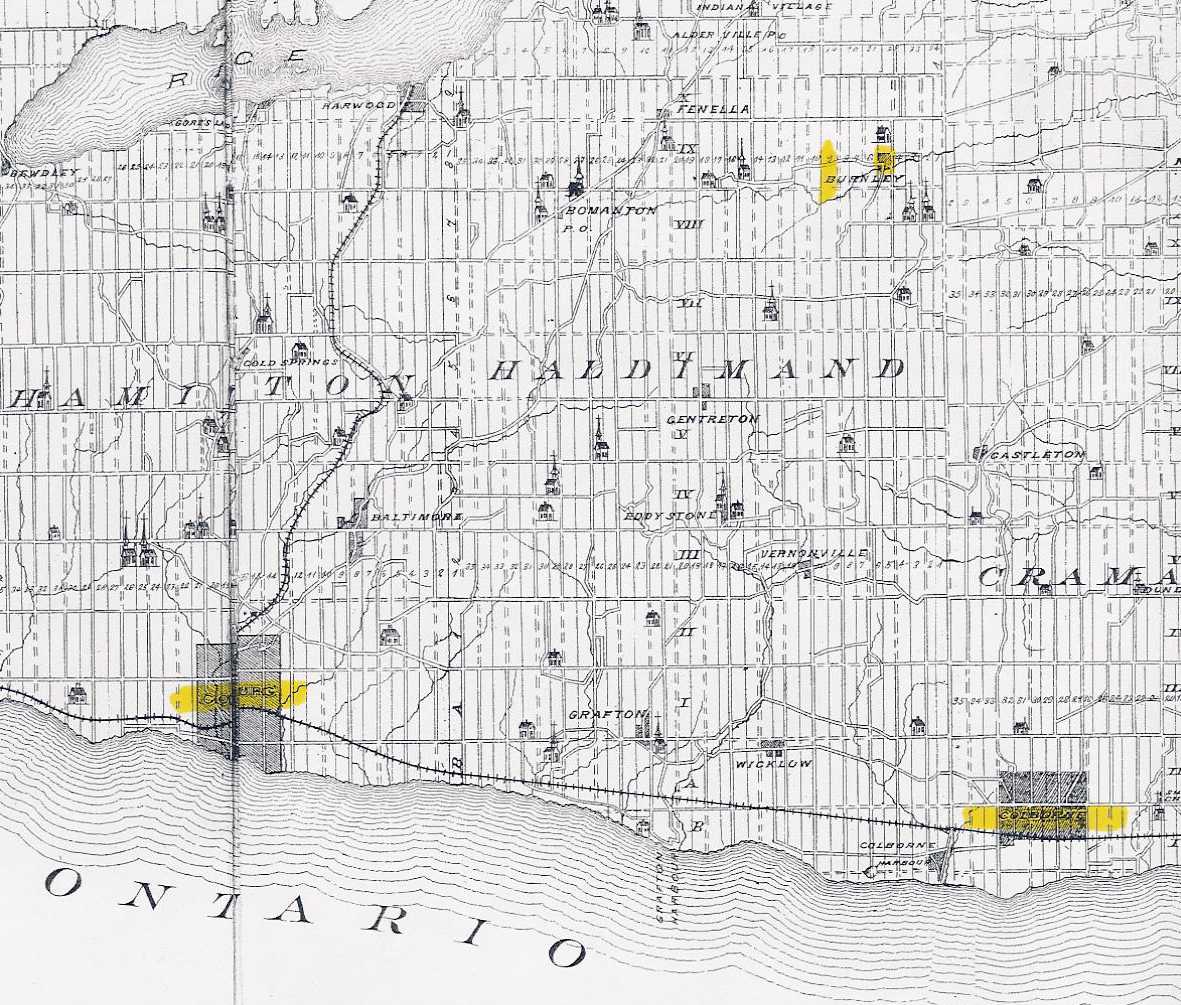 The Historical Atlas of Durham and Northumberland Counties3 contains two maps that show the area where the Grimshaw settlement was located. Although the settlement is not identified specifically, the location can be determined from the description provided in the preceding section. The first image below shows the probable location on a large-scale map of Haldimand Township. A more regional map, shown in the second image below, indicates the location of the Grimshaw settlement in relation to Lake Ontario, Rice Lake, and the communities of Coburg and Colburne.