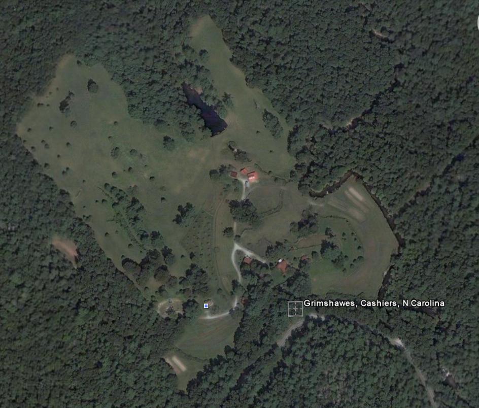 Closer view of Grimshawes location, showing cleared area, roads, and small dam and reservoir. The main home is just northwest of the rectangle signified as “Grimshawes, Cashiers, N Carolina”.
