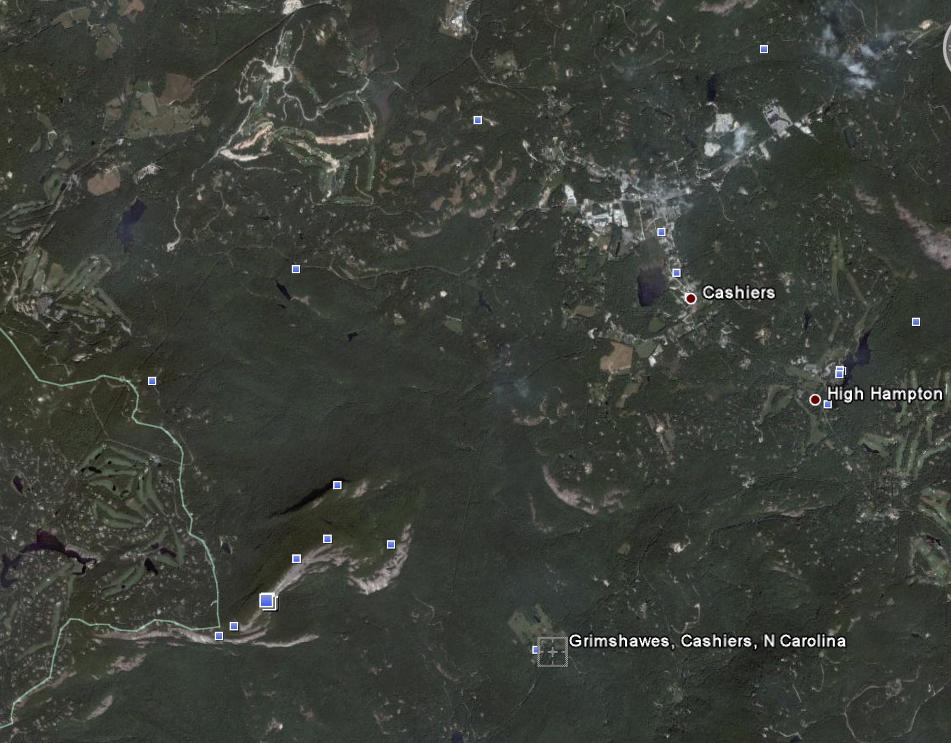 Grimshawes location southwest of Cashiers. Whiteside Mountain can readily be seen just northeast of Grimshawes.