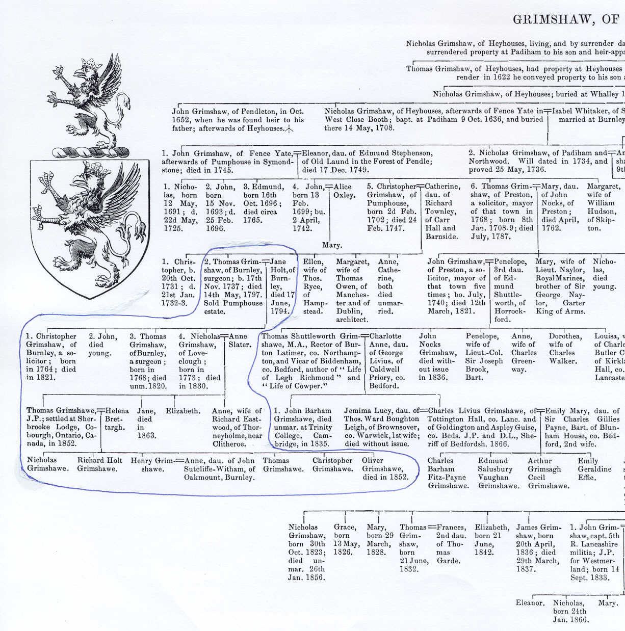 Portion of Whitaker’s1 Pendle Forest Grimshaw descendant chart, showing the Thomas Grimshawe family lineage (circled in blue). The individuals show on the chart are also included in Figure 1 above.