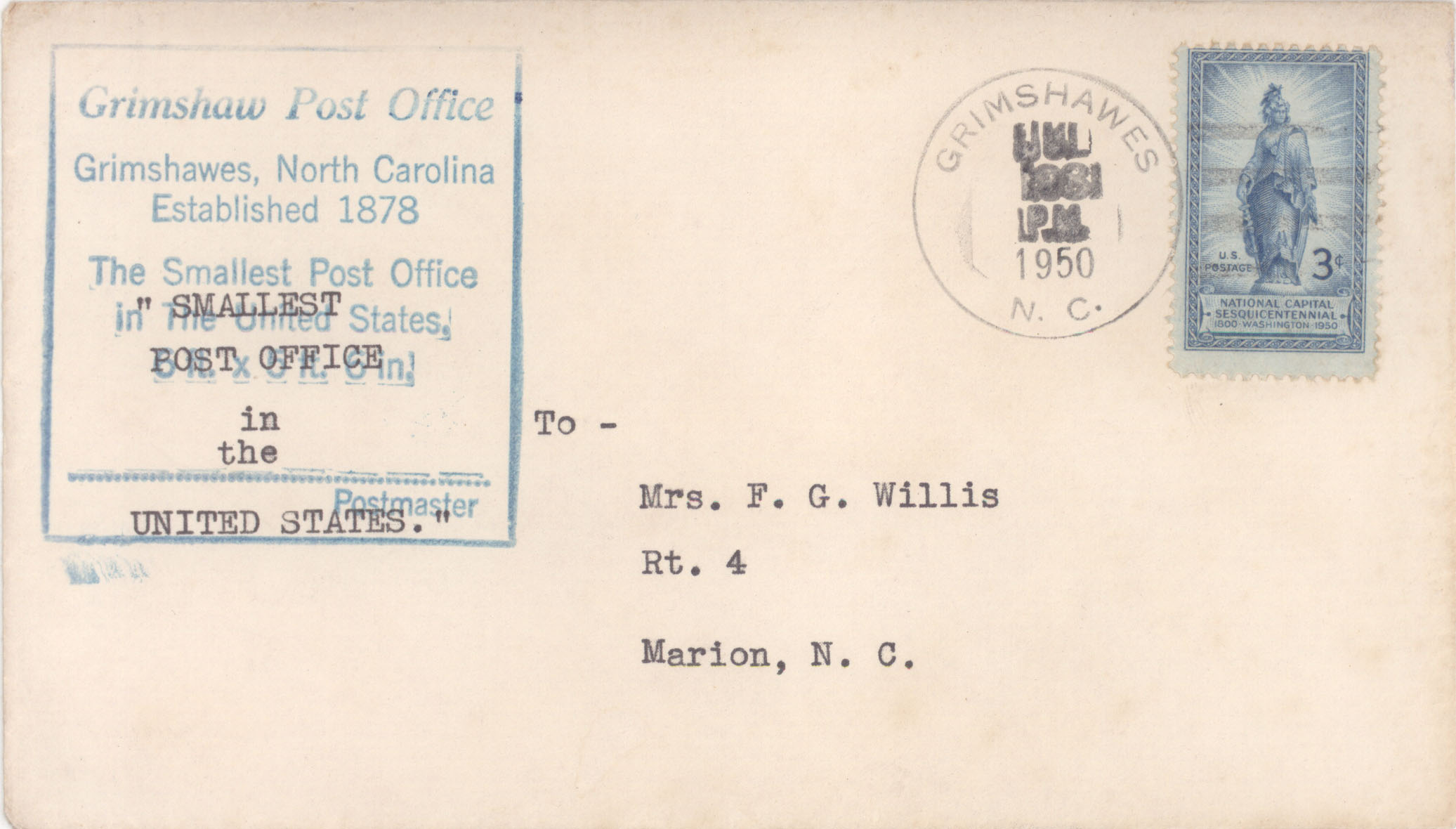Post Office at Grimshawe’s. The post office was built by Thomas Grimshawe and gained its reputation as the smallest post office in the nation. Stamp collectors and enthusiasts from around the world wrote there to get letters postmarked with the Grimshawes postmark.