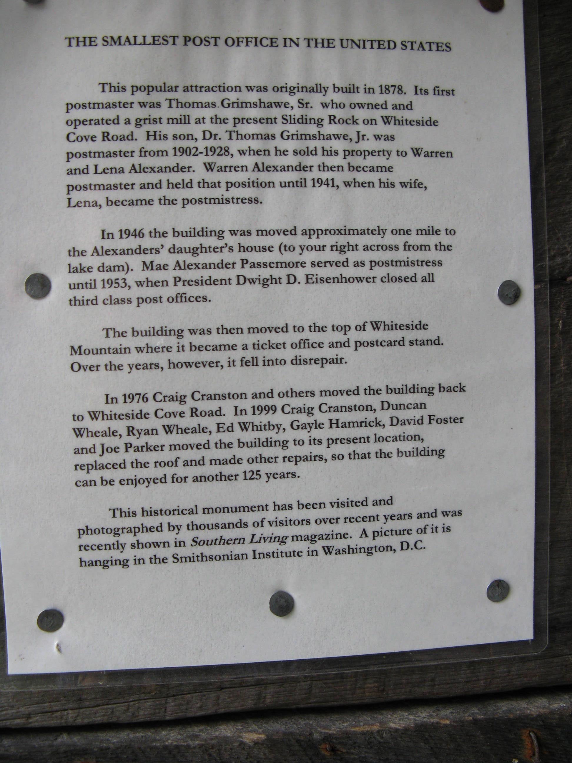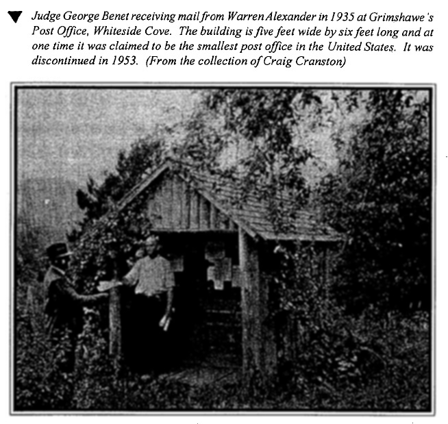 The post office building is also on Whiteside Cove Road, about a mile from the entrance to Grimshawe’s, near a small dam and reservoir.