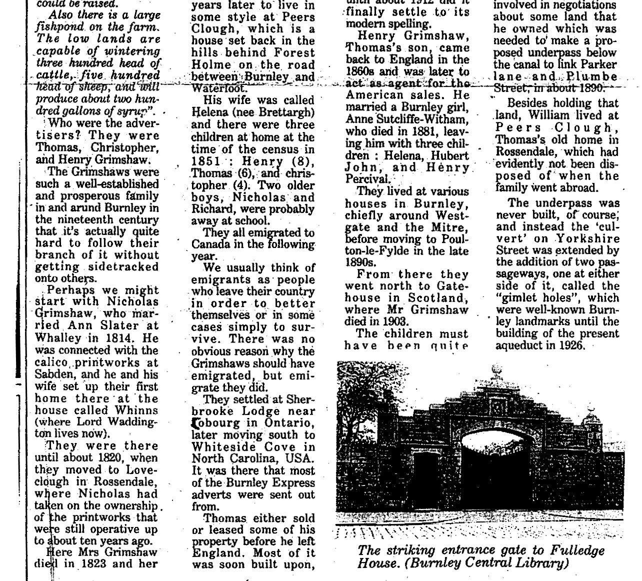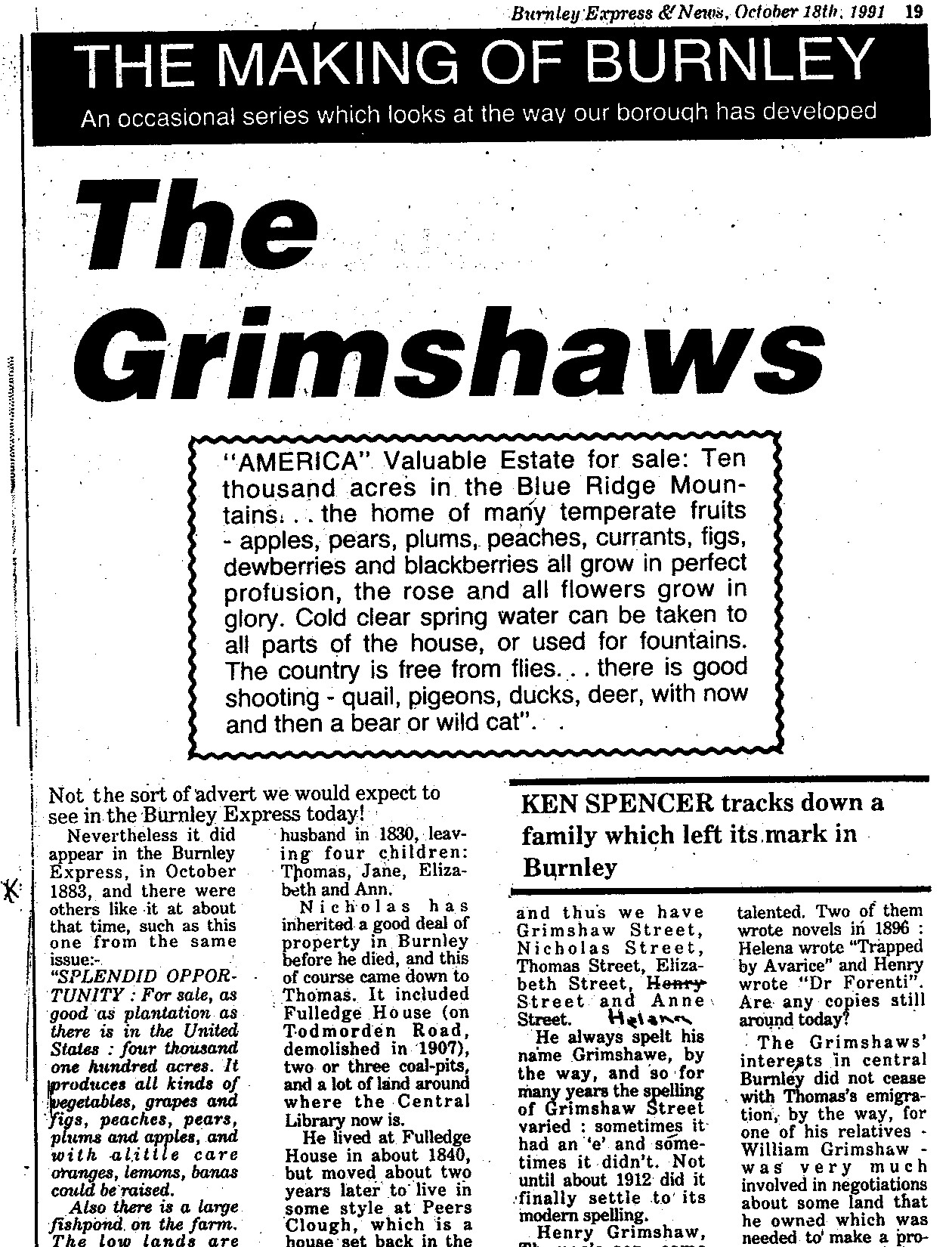 Mavis Long provided the following remarkable article from the Burnley Express & News, October 18, 1991 on the Grimshaws who lived in the Burnley area. Among the Grimshaws described are Thomas and Helena Grimshawe and their family. One of their sons, Henry, moved back to England and subsequently to Scotland, where he remained for the rest of his life. Thanks go to Mavis for providing this important article. An excerpt of the most important sections for Thomas and Helena is shown below; images of the complete article are provided further down on this webpage (click here).