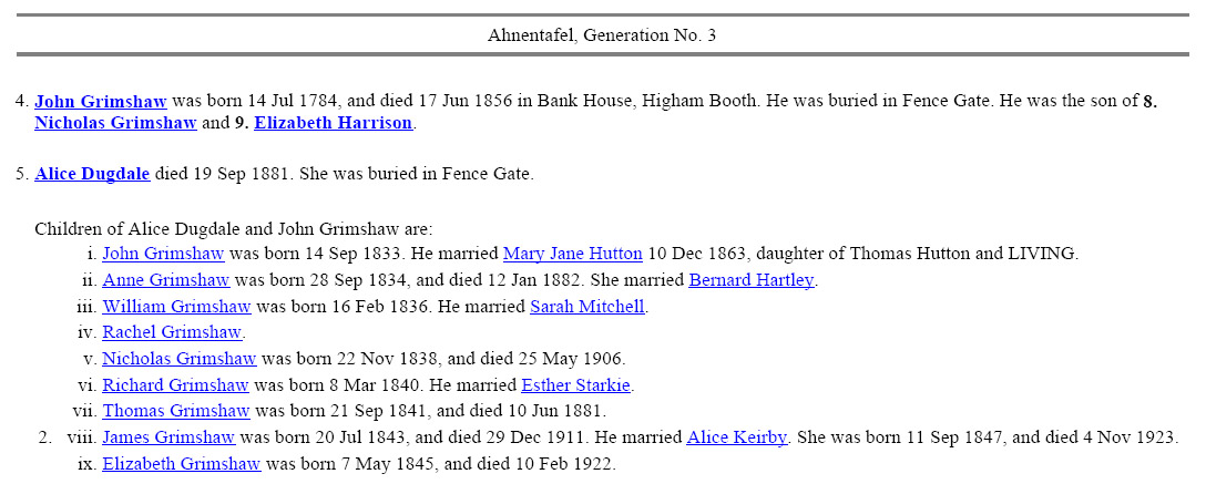 James Grimshaw was the son of John and Alice (Dugdale) Grimshaw and the grandson of Nicholas and Elizabeth (Harrison) Grimshaw. These families are well described by Christopher Telfer on his Rootsweb webpages as follows: