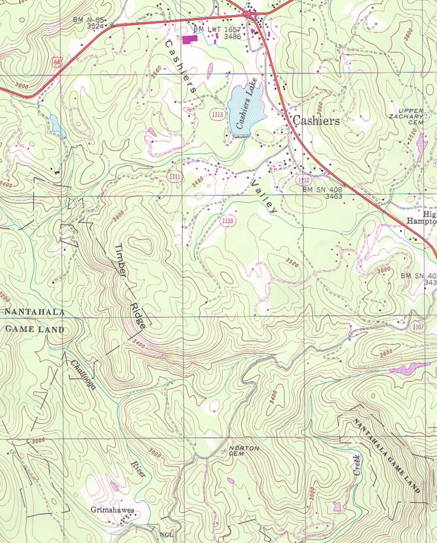 Images from the U.S. Geological Survey topographic quadrangle showing the location of Grimshawe near Cashiers in North Carolina are shown below (Cashiers 7.5-minute quadrangle, scale 1:24,000, published 1997).