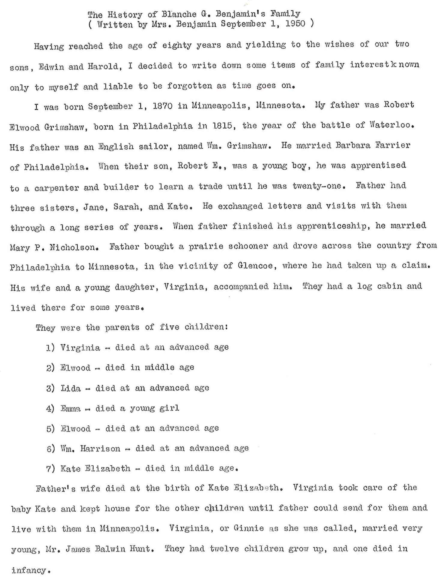 |—-|—-Blanch or Blanche Grimshaw (1 Sep 1870, Minneapolis, MN – 12 May 1951, Minneapolis ) & Dr. Arthur Benjamin (? – 1 Oct 1953). Married 1887, Hutchison, MN. Married 1 Jan 1900.