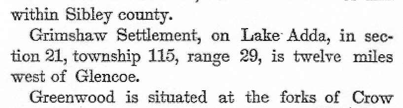Many details of the family’s experiences are recorded in a set of 17 or 18 letters that survive to this day as described further down on this webpage. A remarkably detailed account of the early history of the Lake Addie area is included in Chapter VIII of Curtiss-Wedge’s History of McLeod County9; relevant sections are excerpted below with references to Robert and Mary Grimshaw and their family shown in bold.