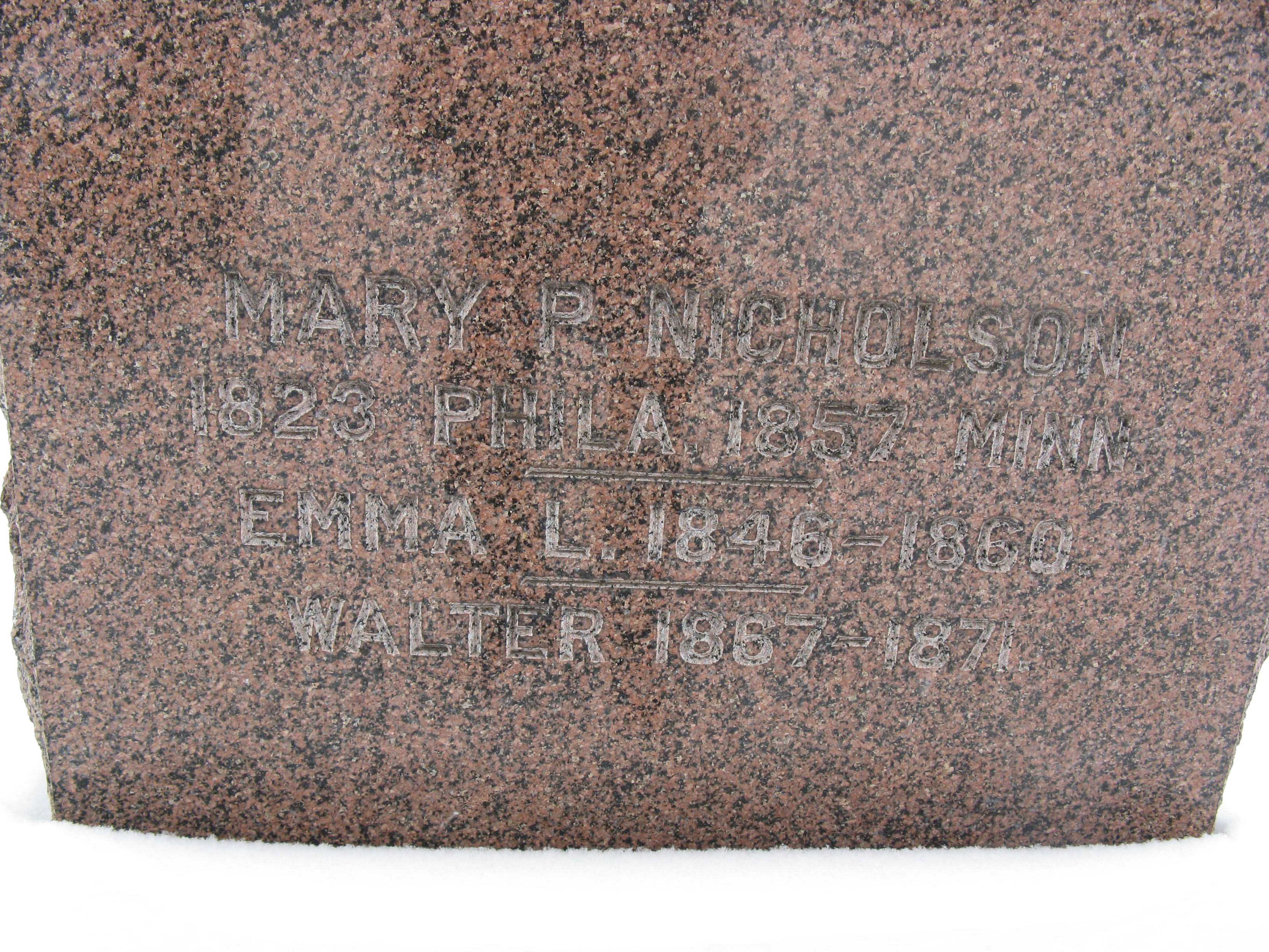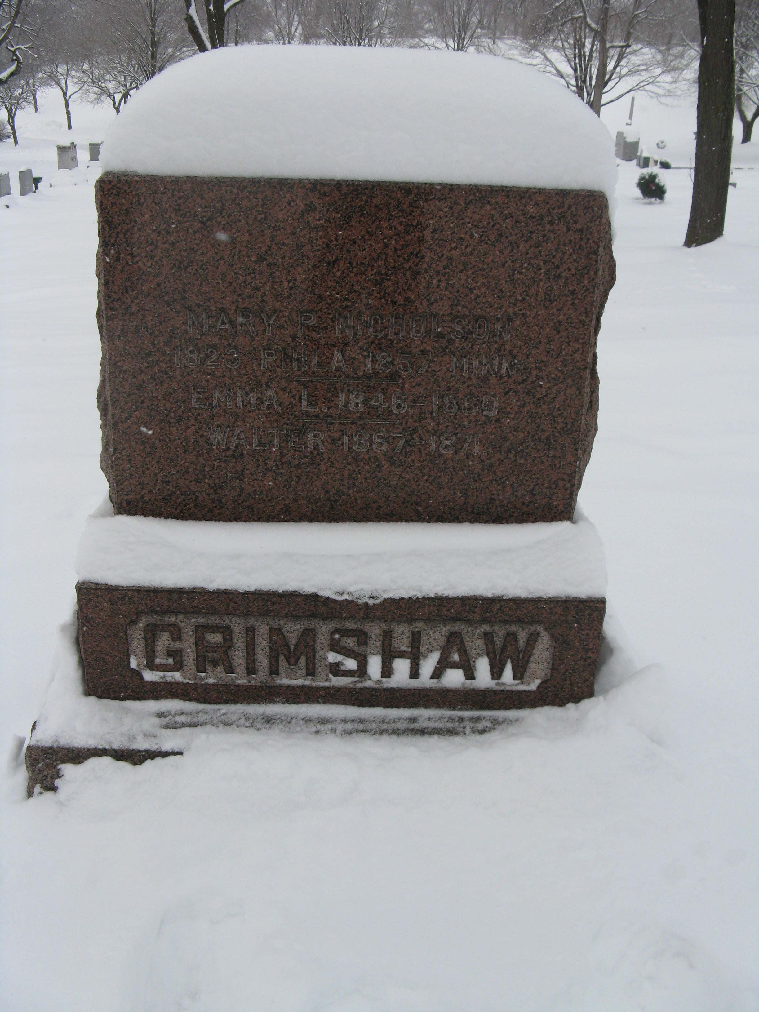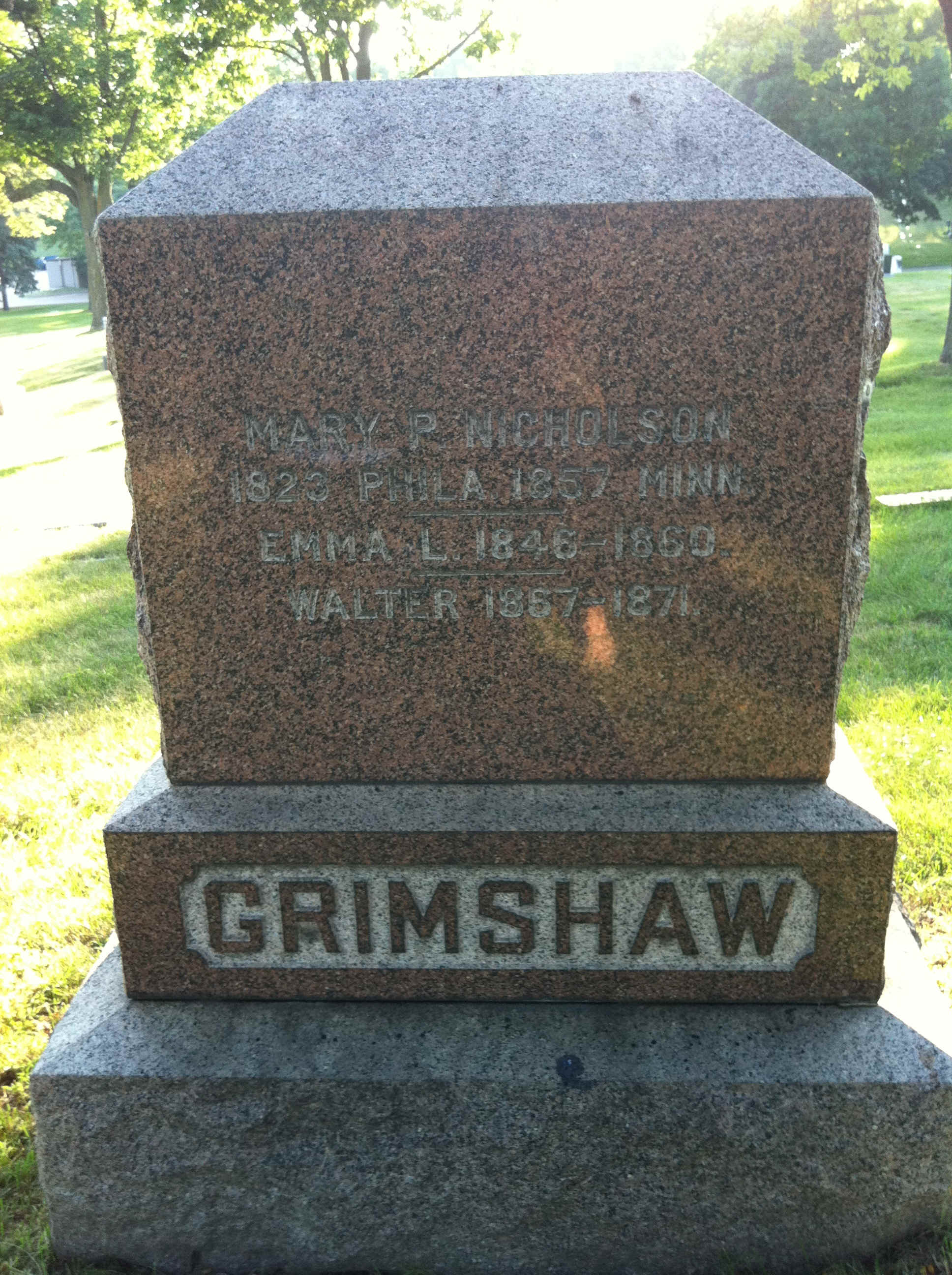 |—-Robert Elwood Grimshaw* (12 or 20 Nov 1815, Philadelphia, PA – 10 Jun 1900, Minneapolis, MN) & Mary Page Nicholson (?, Philadelphia, PA – 1 Sep 1857, Minneapolis, MN?). Married September 23, 1840.