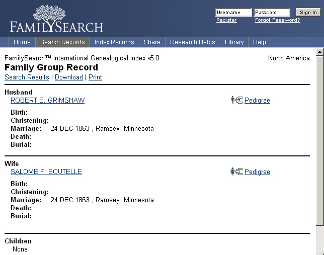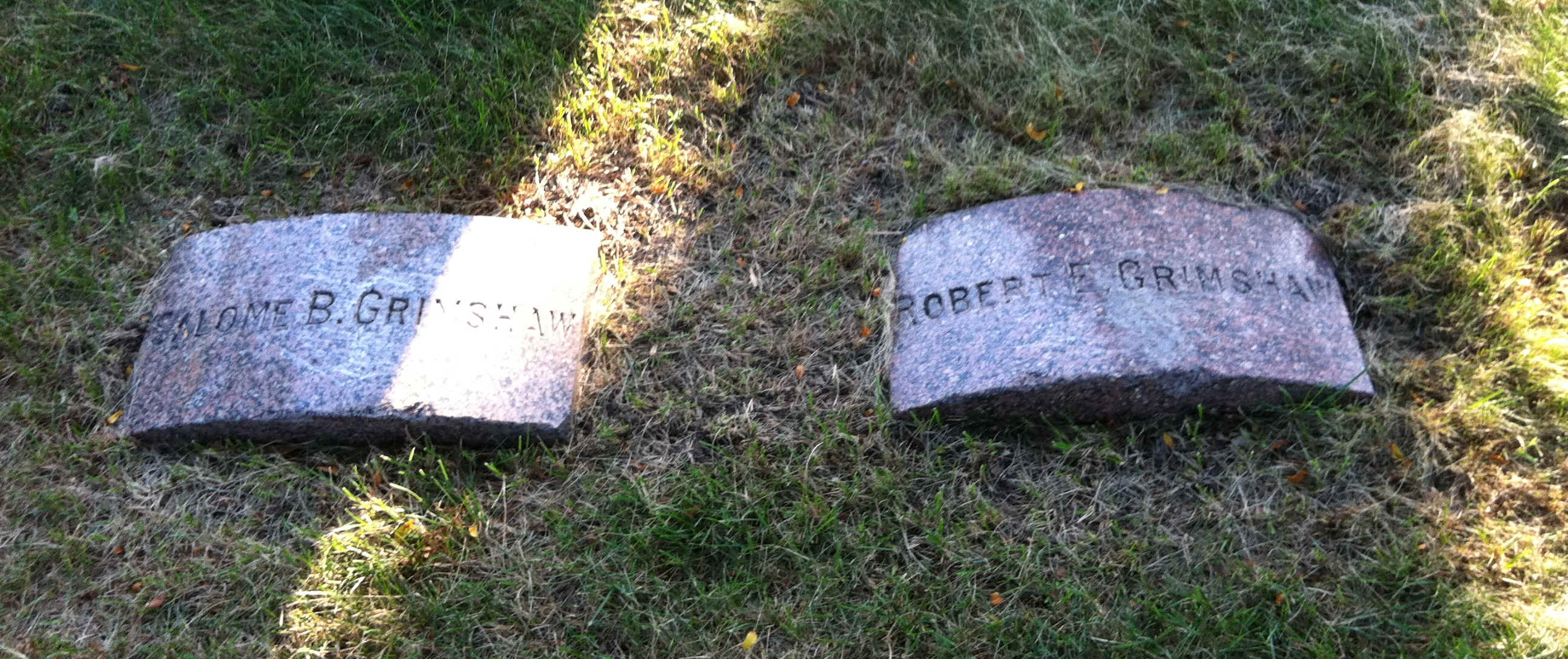 |—-Robert Elwood Grimshaw* (20 Nov 1817, Philadelphia, PA – 10 Jun 1900, Minneapolis, MN) & Salome Boutelle (b 1832, West Enosburg, VT – 1915). Married 24 Dec 1863 in Ramsey, MN.