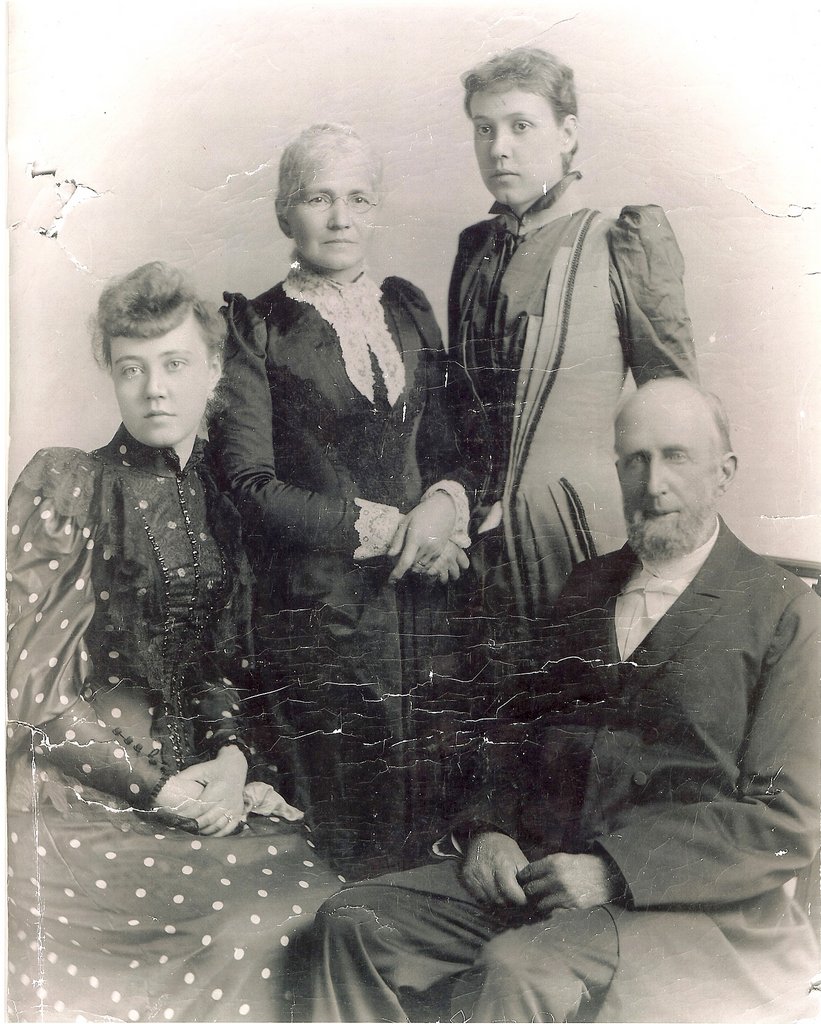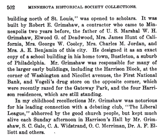 Little information on William and Barbara has been found, but much is known about their son, Robert Elwood Grimshaw and his two families. A great deal of information is contained in a family history of Blanche Grimshaw Benjamin, youngest child of Robert, which she wrote in 1950 on her 80th birthday. Robert was born in 1815 or 1817 and was “apprenticed as a young boy to a carpenter and builder to learn a trade until he was twenty-one” according to the family history by Blanche. Robert and his first wife, Mary Page (Nicholson) Grimshaw, had seven children. They moved their family from their birthplace in Philadelphia to Minnesota in 1856, when it was still a frontier area. Most of the travely was by boat, down the Ohio River and up the Mississippi to Minneapolis. Robert was apparently the leader of a group of several Philadelphia families that homesteaded in McLeod County, as the settlement was called “Grimshaw Grove” or “Grimshaw Settlement”. Nearby Lake Addie was named by Robert for a daughter in one of the families. Mary Grimshaw died during childbirth about a year after the move to Grimshaw Grove. She makes reference to an upcoming birth in a letter she wrote in July, 1857, and she died in September, when daughter Kate was born. Robert subsequently moved to Minneapolis in 1859, where he was engaged in the construction business and became a prominent citizen. He married again, to Salome Boutelle in 1863, and had three more children, Maude, Walter, and Blanche.