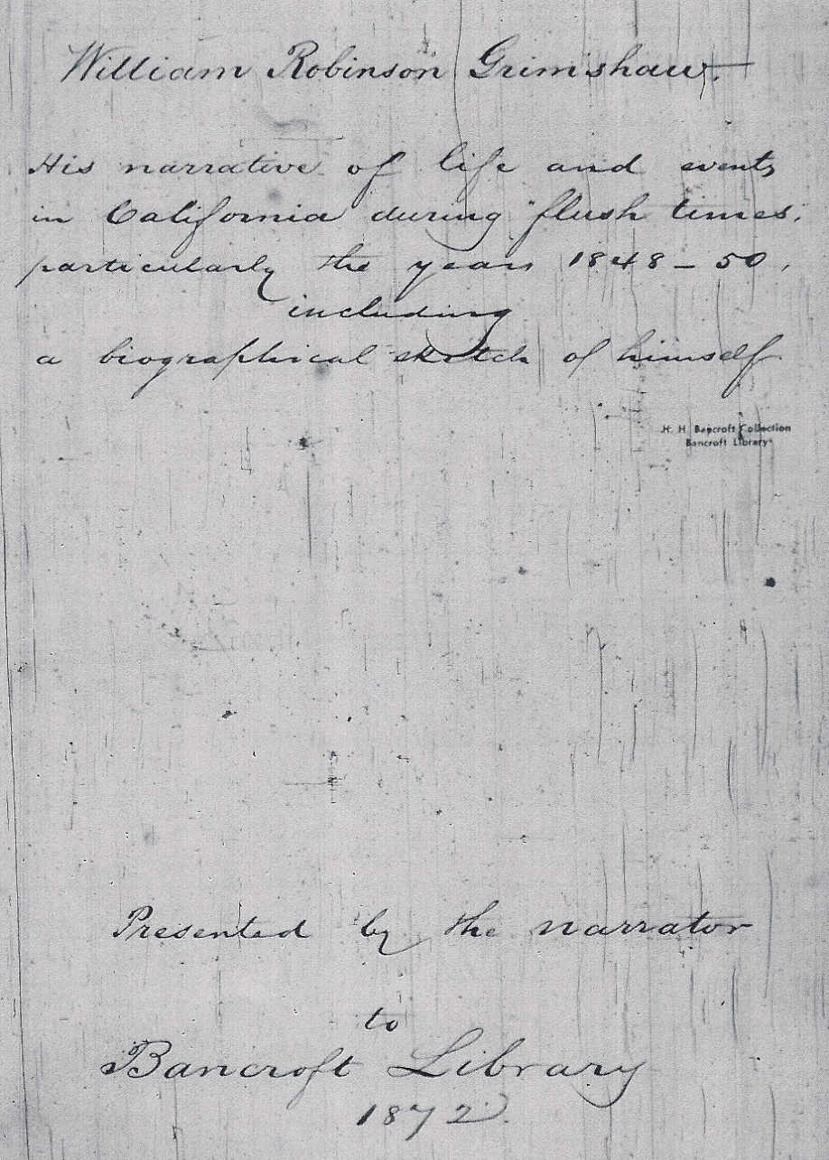1Kantor, J.R.K., 1964, Grimshaws Narrative, Being the Story of Life and Events in California during Flush Times, Particularly the Years 1848-50, Including a Biographical Sketch, Written for the Bancroft Library in 1872 by William Robinson Grimshaw: Sacramento, CA, Sacramento Book Collectors Club, 59 p.