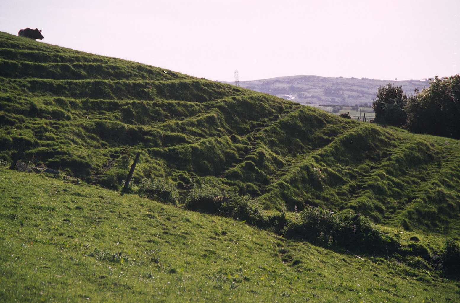 The lower figure shows a succession of active slumps on a steep hillside which resemble a staircase with at least twelve “treads.” The cow on the upper left corner indicates the scale.