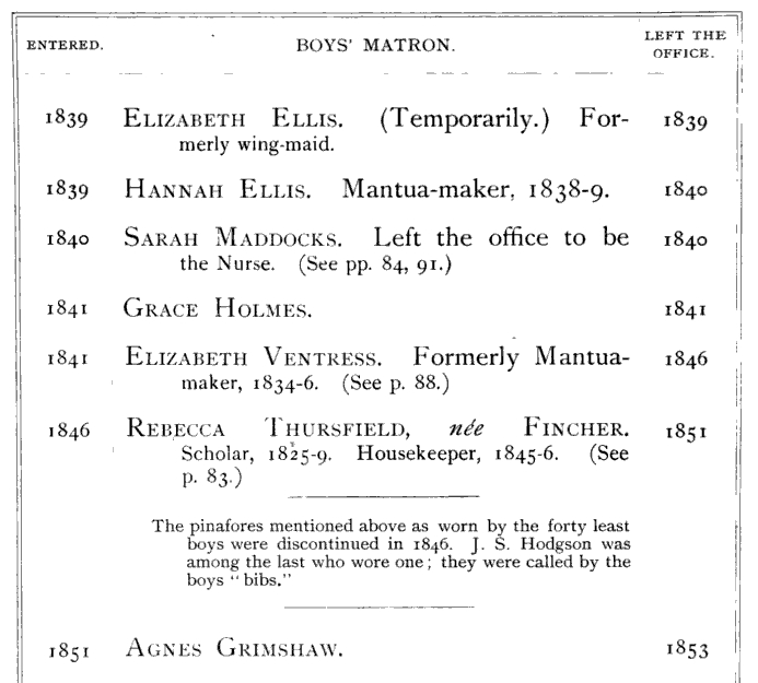After the above photo was received from Richard, the following record of Agnes Grimshaw’s assignment as a “Boys’ Matron” was found in an 1895 reference by Hodgson2 (p. 86):