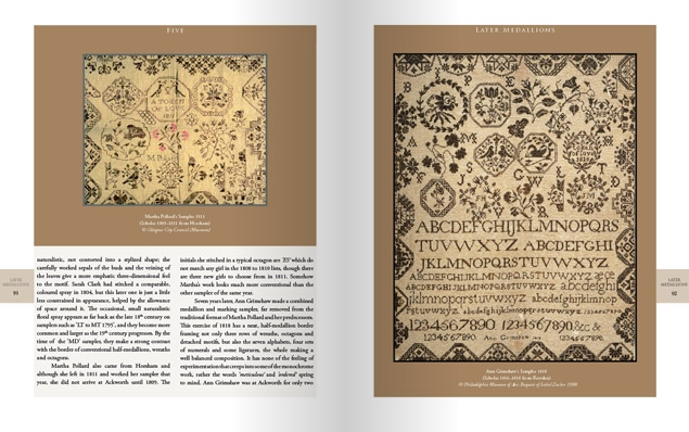 “Ann Grimshaw made a combined medallion and marking sampler, far removed from the traditional format of Martha Pollard and her predecessors. This exercise of 1818 has a neat, half-medallion border framing not only three rows of wreaths, octagons and detached motifs, but also the seven alphabets, four sets of numerals and some ligatures, the whole making a well balanced composition. It has none of the feelings of experimentation that creeps into something of the monochrome work, rather the words “meticulous” and “ordered” spring to mind. Ann Grimshaw was at Ackworth for only two years, 1816-18 . She was obviously a talented young needlewoman who felt able to unify two traditional formats and create something , which so far is unique. Another exceptional feature is the use of black treat as opposed to the somber greens and browns. Ann must have decided that black for both marking and medallions would produce a more pleasing whole, or it could be, there were no colored silks available to her”.