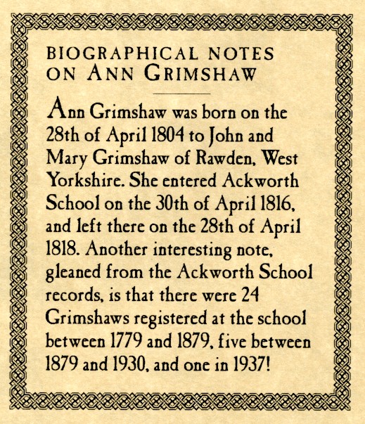 Thanks go to The Scarlet Letter for providing background information on Ann Grimshaw in the cross-stitching kit they sell under a royalty arrangement. Thanks also to Richard Walker for providing additional information on Ann Grimshaw’s work and the picture of Agnes Grimshaw of Ackworth School. Click here for the webpage on Richard’s Grimshaw family line.