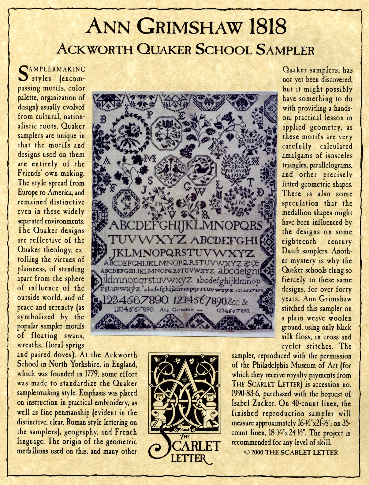 Ann Grimshaw was born in Calverley, Yorkshire and attended Ackworth School from 1816 to 1818, during which time (in 1818) she created a “sampler” of cross stitching. She was about 13 years old at the time. Her work is now at the Philadelphia Museum of Art and has become a popular item among cross stitch enthusiasts. The pattern is sold under a royalty arrangement with the Philadelphia Art Museum by the firm, The Scarlet Letter.