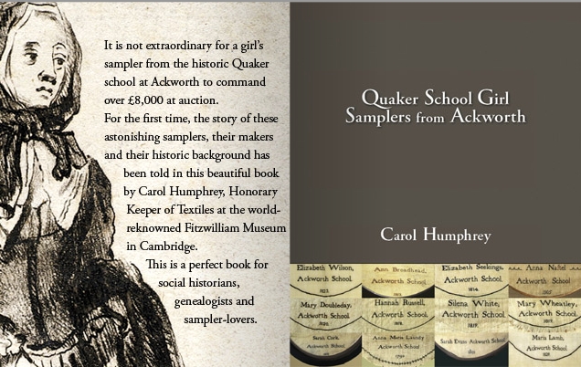 …last Easter I was … at the Ackworth Old Scholars week-end and bought a book titled “Quaker School Girls Samplers from Ackworth1 by Carol Humphrey. IBSN 1:0-9552086-1-0″– Carol being the Keeper of textiles at the Fitzwilliam Museum, Cambridge and a “world leading authority on textiles & samplers”.