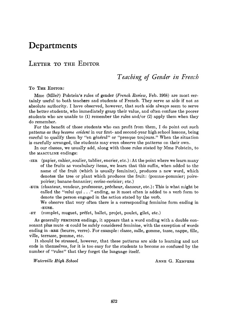 The French Review, Vol. 41, No. 6 (May, 1968), p. 872Anne Grimshaw Kempers was apparently a graduate of the University of Rochester, New York. Her death was noted in the “Rochester Review” — dated Winter 1999-2000 — as occurring in January 1995.