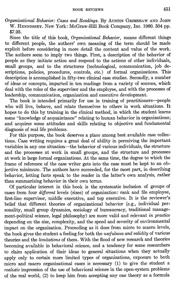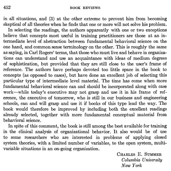 6Summer, Charles, 1961, Book Review of “Organizational Behavior: Cases and Readings”: Management Science, v. 7, issue 4, p. 451-2.