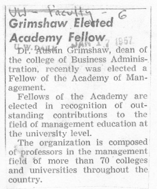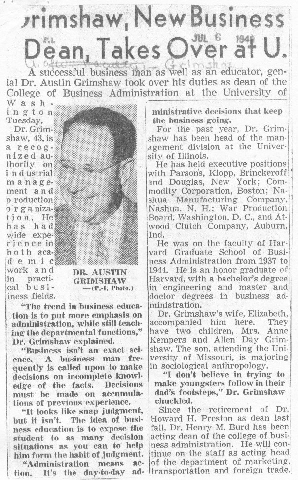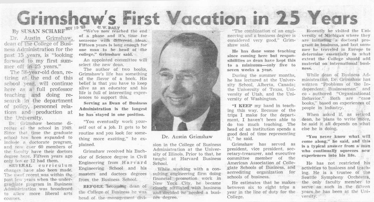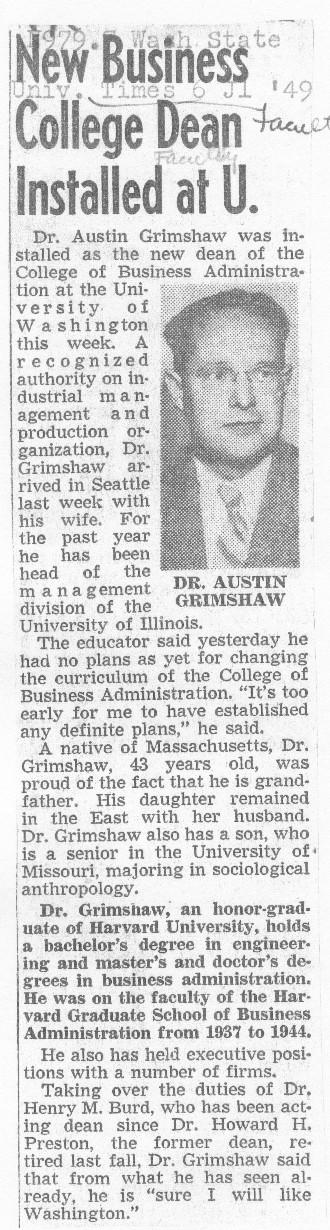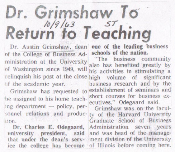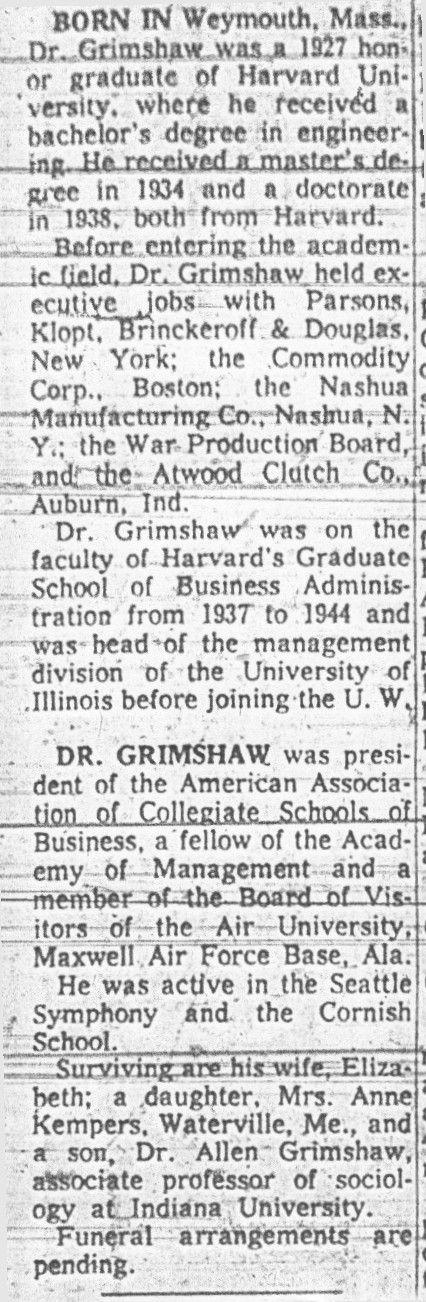 Dr. Grimshaw was employed at the War Production Board in Washington, D.C. during World War II and subsequently taught at the University of Illinois. In 1949 moved to the University of Washington, where he was appointed Dean of the Business School. He held that position until 1963, when he gave up the deanship and returned to teaching. He left the University in 1964, and passed away in January 1965 after becoming ill while on vacation in California.