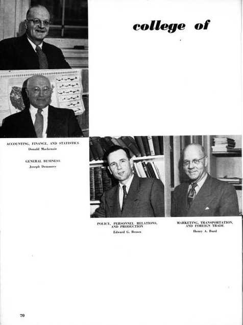 Among the many outstanding professors who contributed significantly to the early development of the College, alumni will recall the names of Henry A. Burd – who also served as Acting Dean in 1938-1939-Raymond F, Farwell, Homer E. Gregory, Donald H. Mackenzie Carl S. Dakan. James A1. Mcconahey, and Macy M. Skinner. Perhaps most vividly remembered is Professor Cox. Although his service in the deanship was brief, no one contributed more to the growth and development of the College. His membership on the faculty dated from 1919 until his retirement in 1957, and his devotion to the cause of higher education for business continued until his death in 1966. Professors S. Darden Brown, Joseph Demmery, Nathanael H. Engle and Frank H. Hamack retired in recent years after long and meritorious service. A listing of current faculty members appears following this article, but it would be remiss not to mention at this point three who have served faithfully and well for more than half of the lifetime of the College-Arthur N. Lorig, Charles J. Miller, and Julius Roller.
