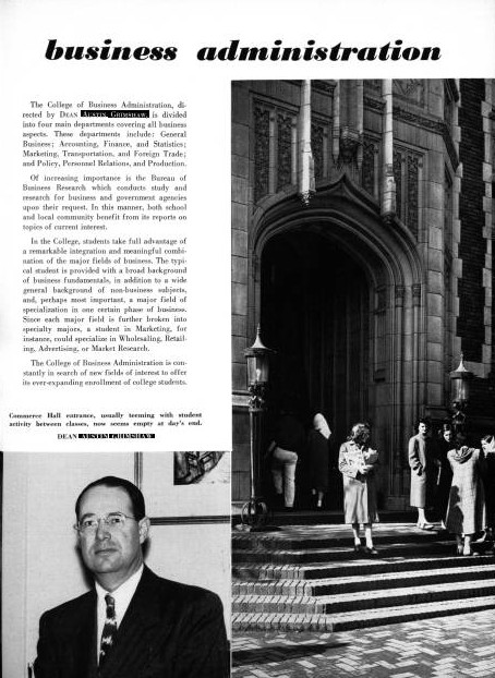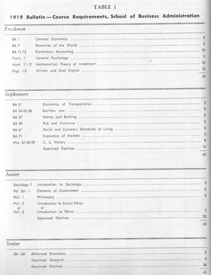 Instead of being integrated as a department within the college of arts and sciences, the School of Business Administration was its own separate college. The business school was combined with the economics department which was removed from the arts and sciences, and on March 14, 1919 the School of Business changed to the College of Economics and Business Administration to appropriately fit the department. The college had its own entrance requirements and four year program, to encourage students who took business courses during high school to go to the university even though they couldn’t enroll into the college of arts and sciences. And to compensate the students for the potential lack of a liberal education, the business curriculum provided a mix of both business and liberal arts and humanities classes. So along with courses in accounting and statistics, students also took classes such as general psychology and philosophy.