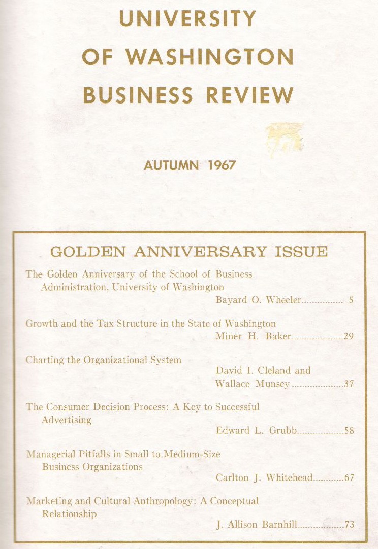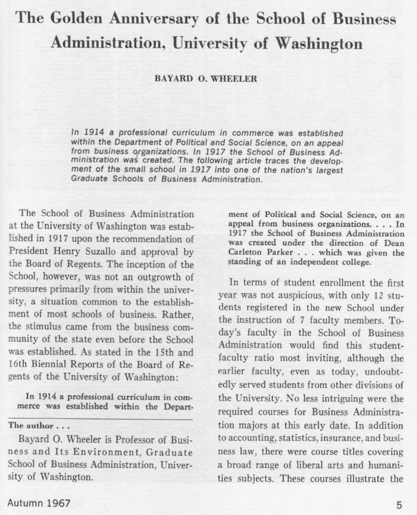 7Wheeler, Bayard O., 1967, The Golden Anniversary of the School of Business Administration, University of Washington: University of Washington Business Review, v 27, no 1 (Autumn 1967), p. 5-28.