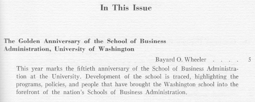 Wheeler, Bayard O. “The Golden Anniversary of the School of Business Administration, University of Washington.” _University of Washington Business Review._ Autumn 1967: 5-28.