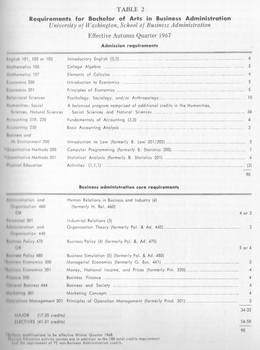Another major change came on December 17, 1965 when the business school changed its name back to School of Business Administration, in order to reflect a new change which would be implemented autumn quarter 1966 – the dismantling of the four-year undergraduate business program and becoming “a two-year upper division school” (Olswang, 1). In a memo from L.D. Goldberg to the business school faculty, several reasons for the change was to allow incoming freshman, who were previously enrolled into the business school during their first year, more time to choose whether or not majoring in business was right for them. The university wanted first year students to experience all the different fields of study offered at the UW, before they became committed to a particular major. Thus business majors were first enrolled in the college of arts and sciences (something they could previously by-pass), and at the end of their sophomore year they would need to apply to the business school before they could become recognized business majors. The second reason for becoming a two year program, was to ease the transition for transfer students from community colleges and other four year universities and colleges to the UW business program. With the School of Business Administration now more accessible to students than ever, an admissions ceiling was put on the school only allowing 1400 students a year in the early 1970’s.