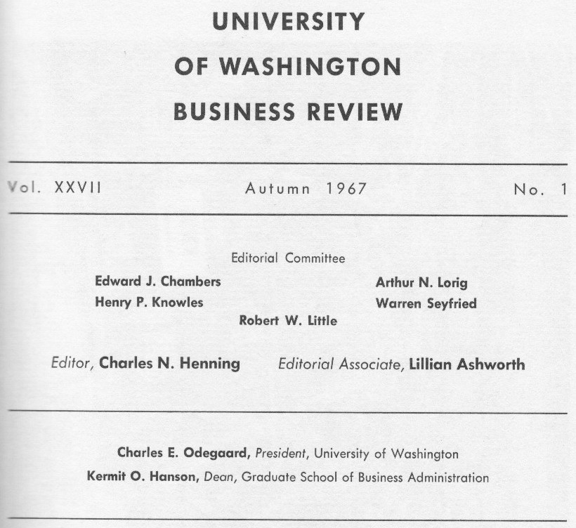 An excellent article7 on the history and development of the Business Administration College was published in the University of Washington Business Review in 1967. Images and the first part of the text of the article are provided below. An English paper on the history of the college was also prepared – by Anna Velasquez – and is provided at the bottom of this webpage.
