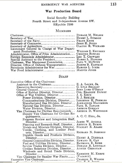 It appears that after graduating with his Ph.D. in Business Administration in 1938, Austin worked for a time at the War Production Board in Washington, D.C. He held the position of Director of the Civilian Relations Division under the Vice Chairman for Civilian Relations, as shown in the following page from the 1943-44 Government Manual.