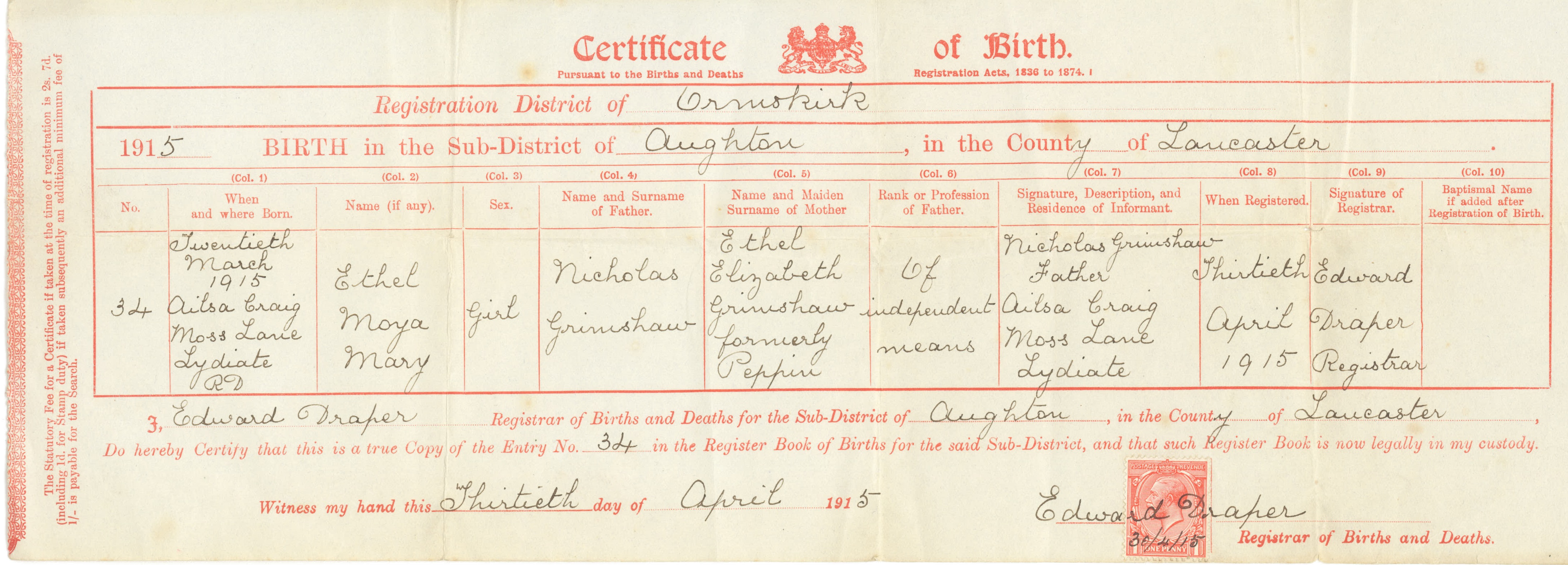 Birth Certificate for Ethel Moya Grimshaw, born 1915