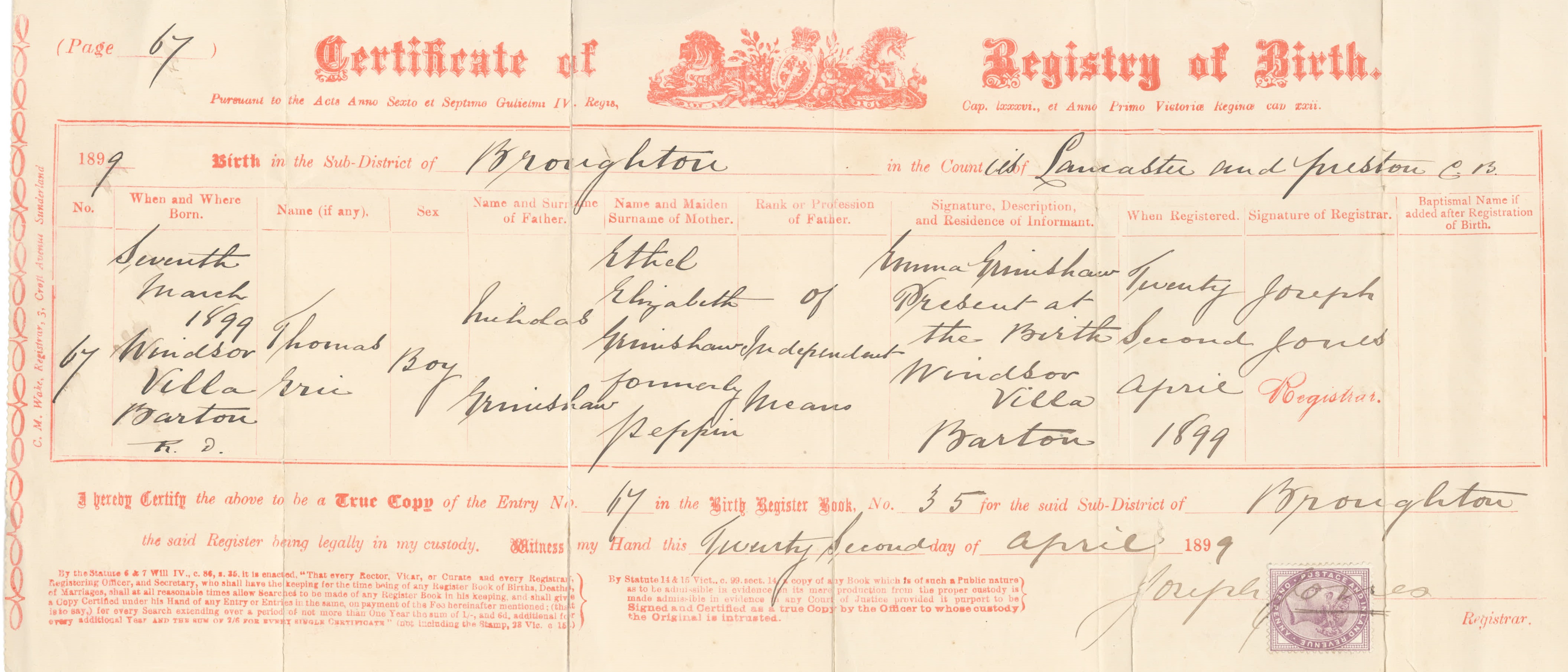 Birth Certificate for Thomas Eric Grimshaw, born 1899