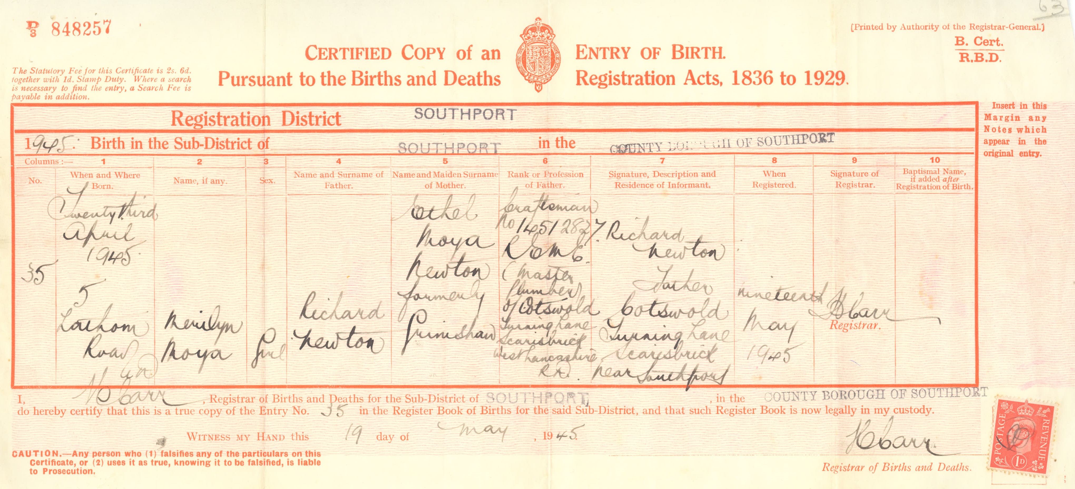 Birth Certificate for Merilyn Tarplee, born 1945